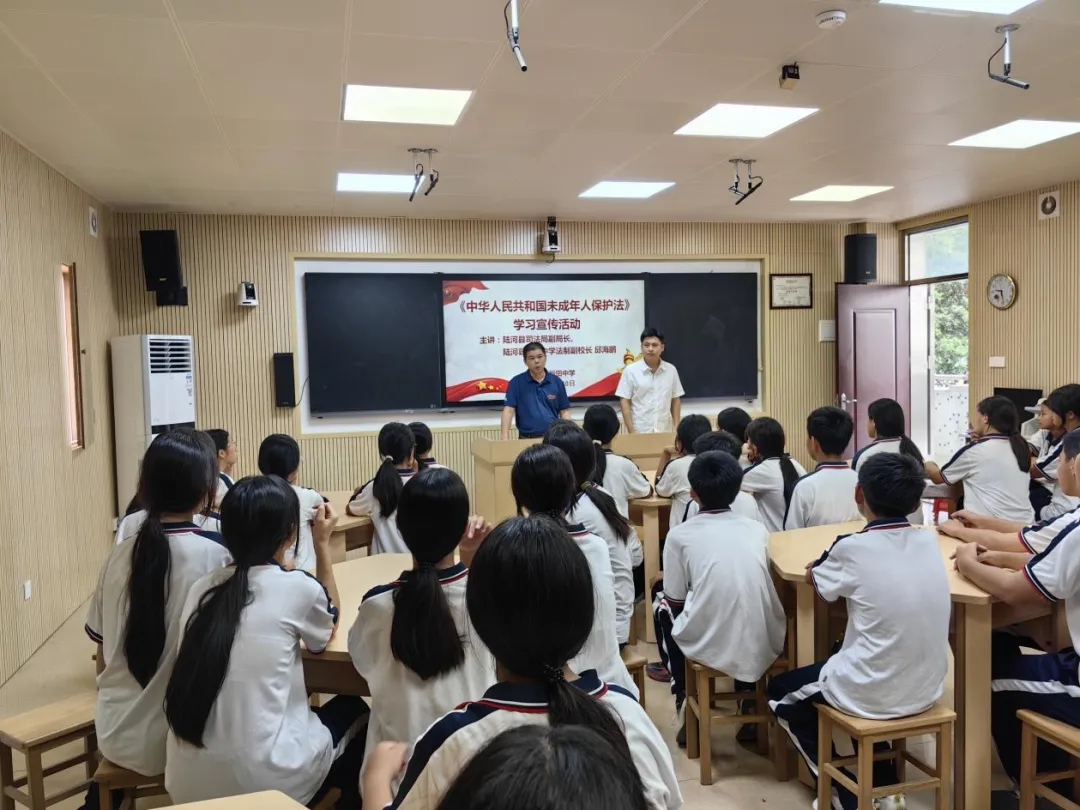 6月16日,县普法办、县司法局联合县教育局、县妇联在河城中学(二中校区)开展“关爱明天 普法先行”——2025年陆河县未成年人保护法治宣传活动。通过典型案例以案释法,深入讲解未成年人保护法律要点,组织学生代表分享学习感悟,现场承诺依法维权。校园内同步陈列法治展板、发放宣传手册,重点普及未成年人保护、校园欺凌防治等法律知识,切实提升师生法治观念与自我保护能力。