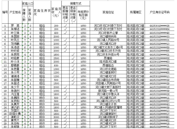 为切实做好我县租赁补贴发放工作,解决城镇低收入家庭住房困难,根据国家保障性住房相关文件规定,经本人申请,居委会、各镇人民政府初审和公示,并经县住房保障部门会同县民政局复审,下列各申请人家庭符合我县租赁补贴发放条件,现予公示,公示期为20个工作日(2017年9月1日至9月20日)。公示期间如有异议,可以以书信、电话等形式向县住房保障工作领导小组办公室(地址:县城朝阳路住建局大楼二楼,电话:5665328)举报。公示期间如有举报,经查实的,将取消其保障资格和按照相关规定处理。
