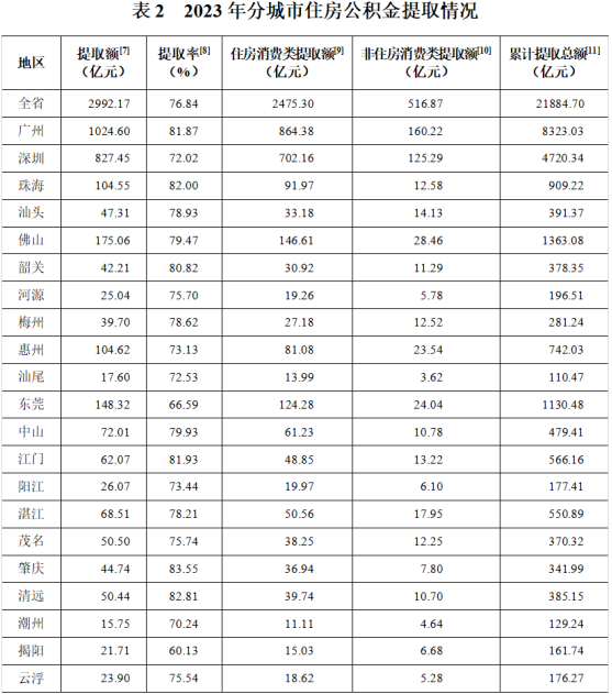 (二)提取:2023年,1117.08万名缴存职工提取住房公积金;提取额2992.17亿元,同比增加18.08%;提取额占当年缴存额的76.84%,比上年增加6.56个百分点。2023年末,提取总额21884.70亿元,比上年末增加15.84%。