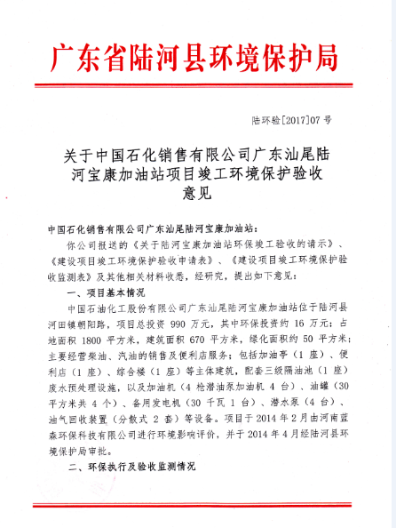 关于中国石化销售有限公司广东汕尾陆河宝康加油站项目竣工环境保护验收意见