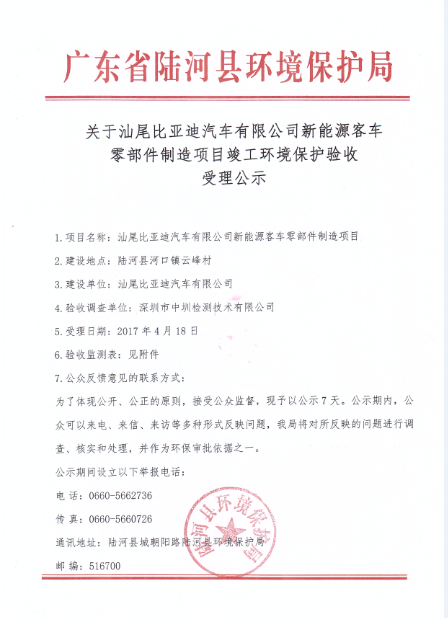 汕尾比亚迪汽车有限公司新能源客车零部件制造项目竣工环境保护验收受理公示