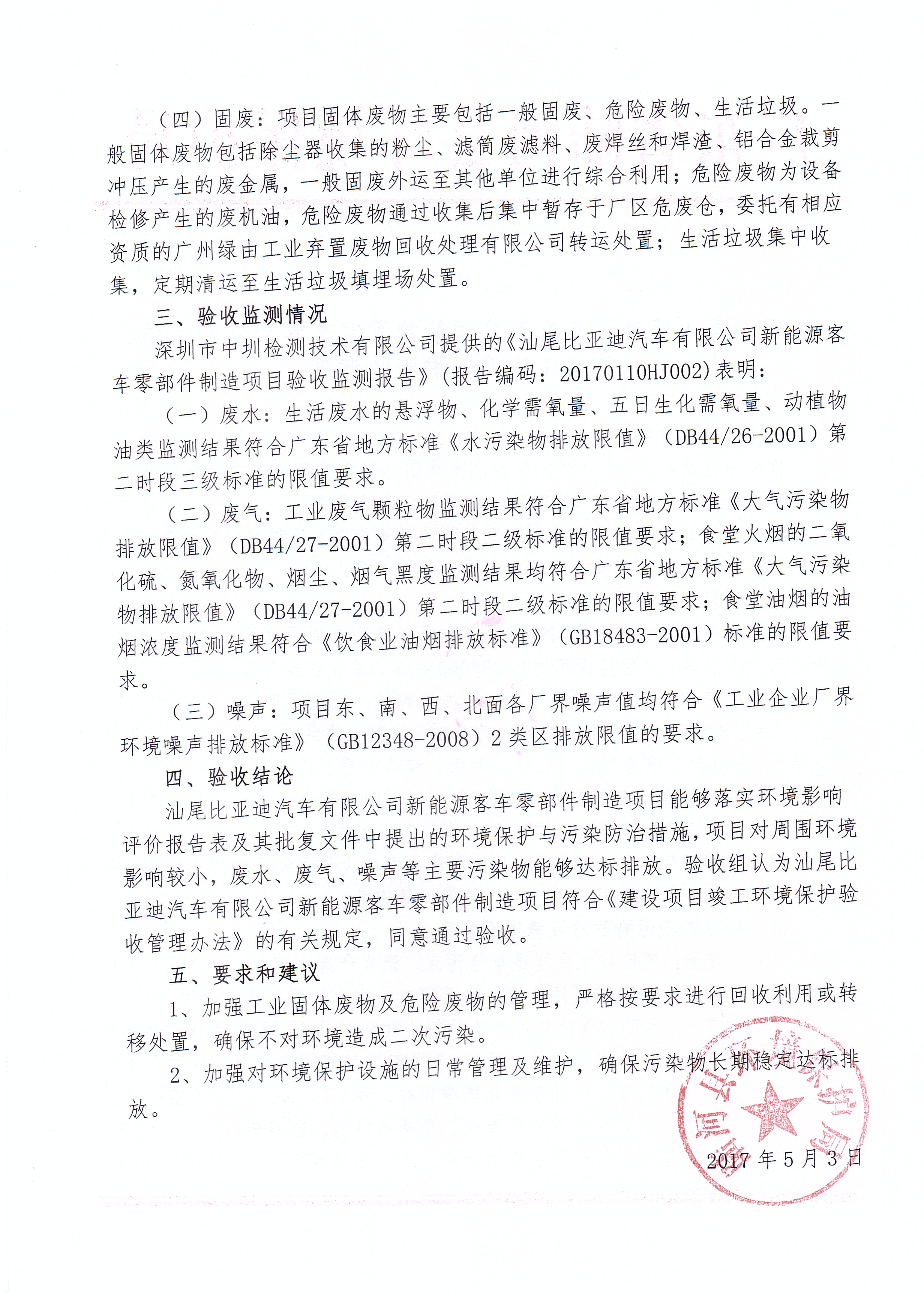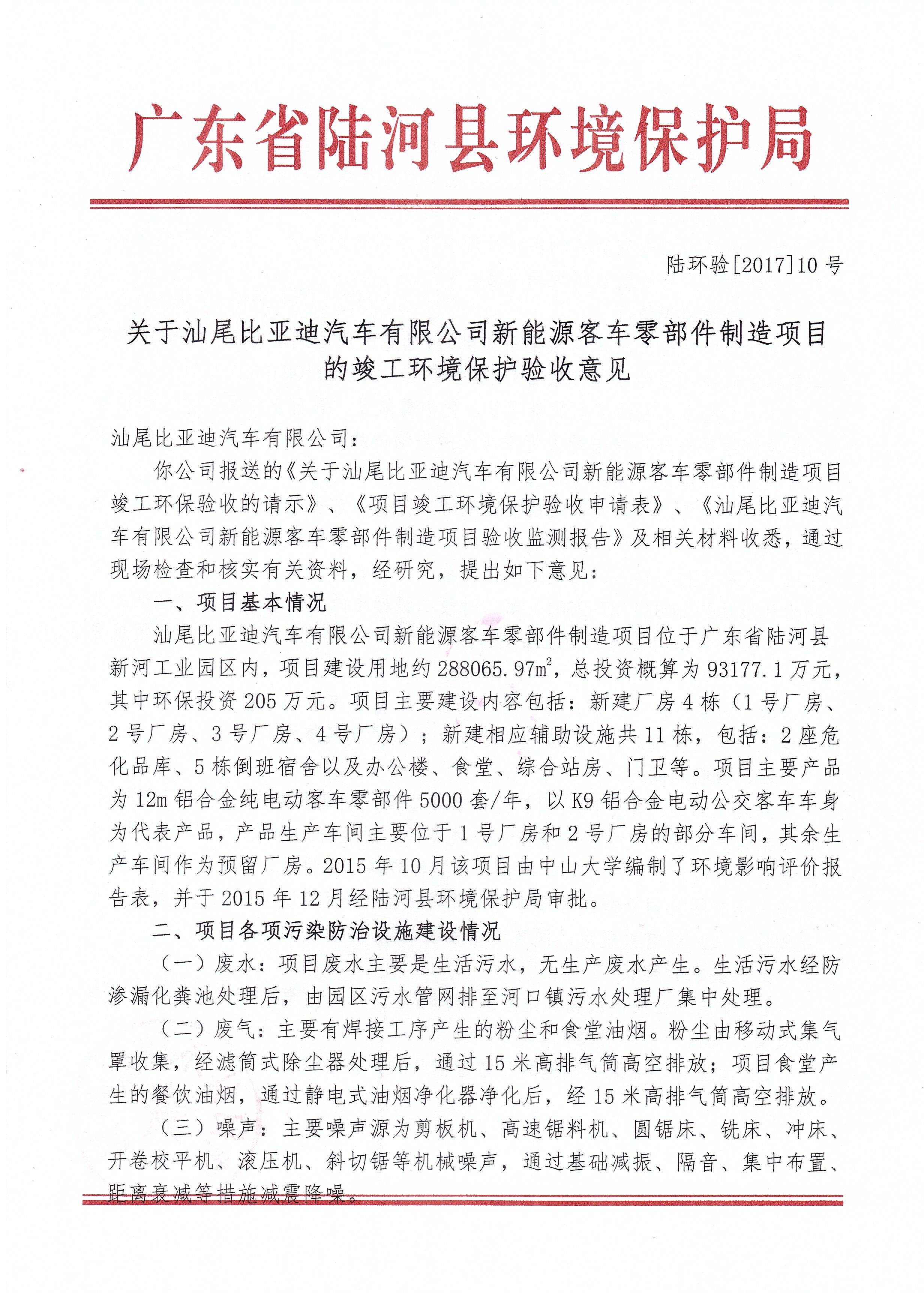 关于汕尾比亚迪汽车有限公司新能源客车零部件制造项目的竣工环境保护验收意见