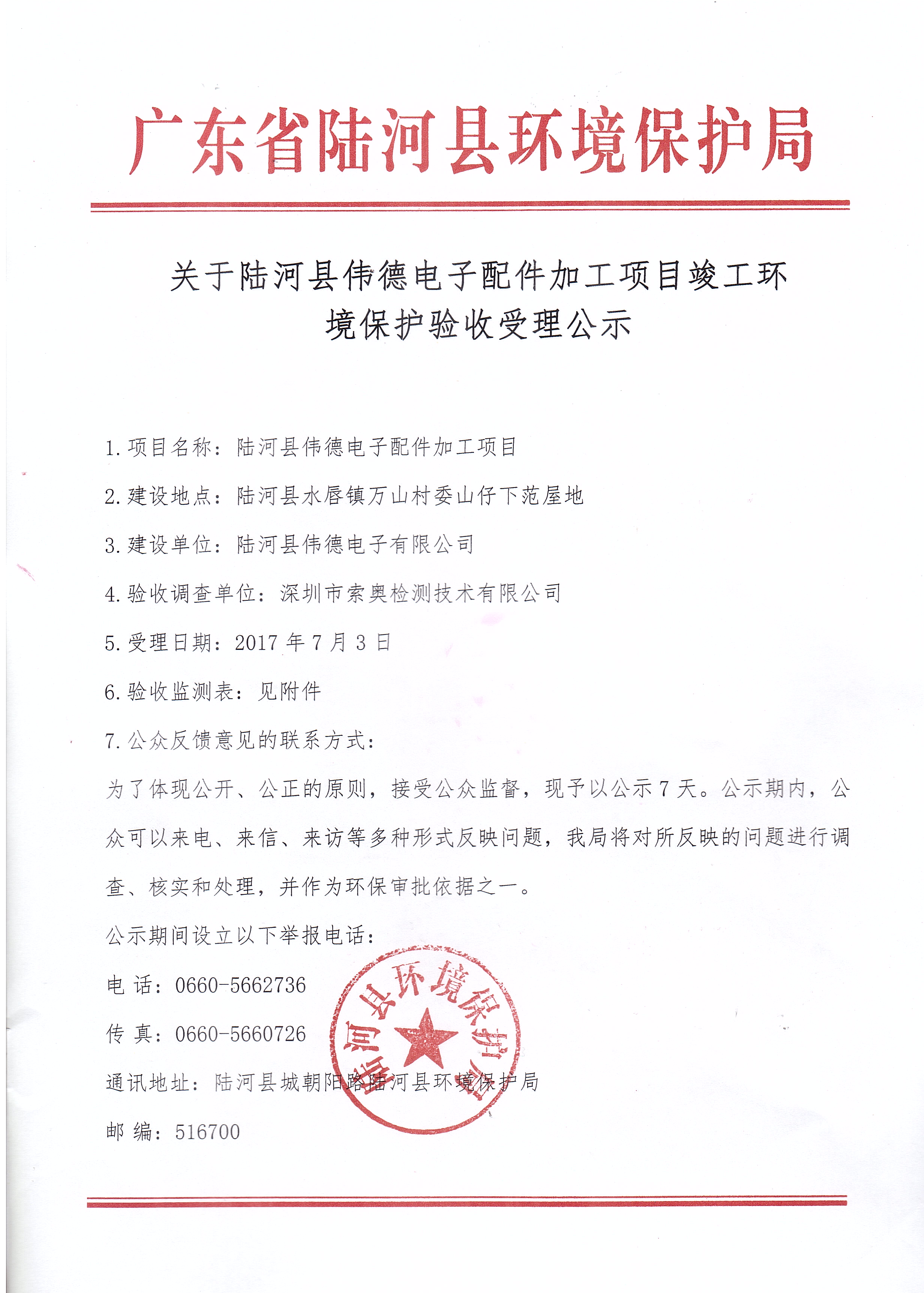 关于陆河县伟德电子配件加工项目竣工环境保护验收受理公示