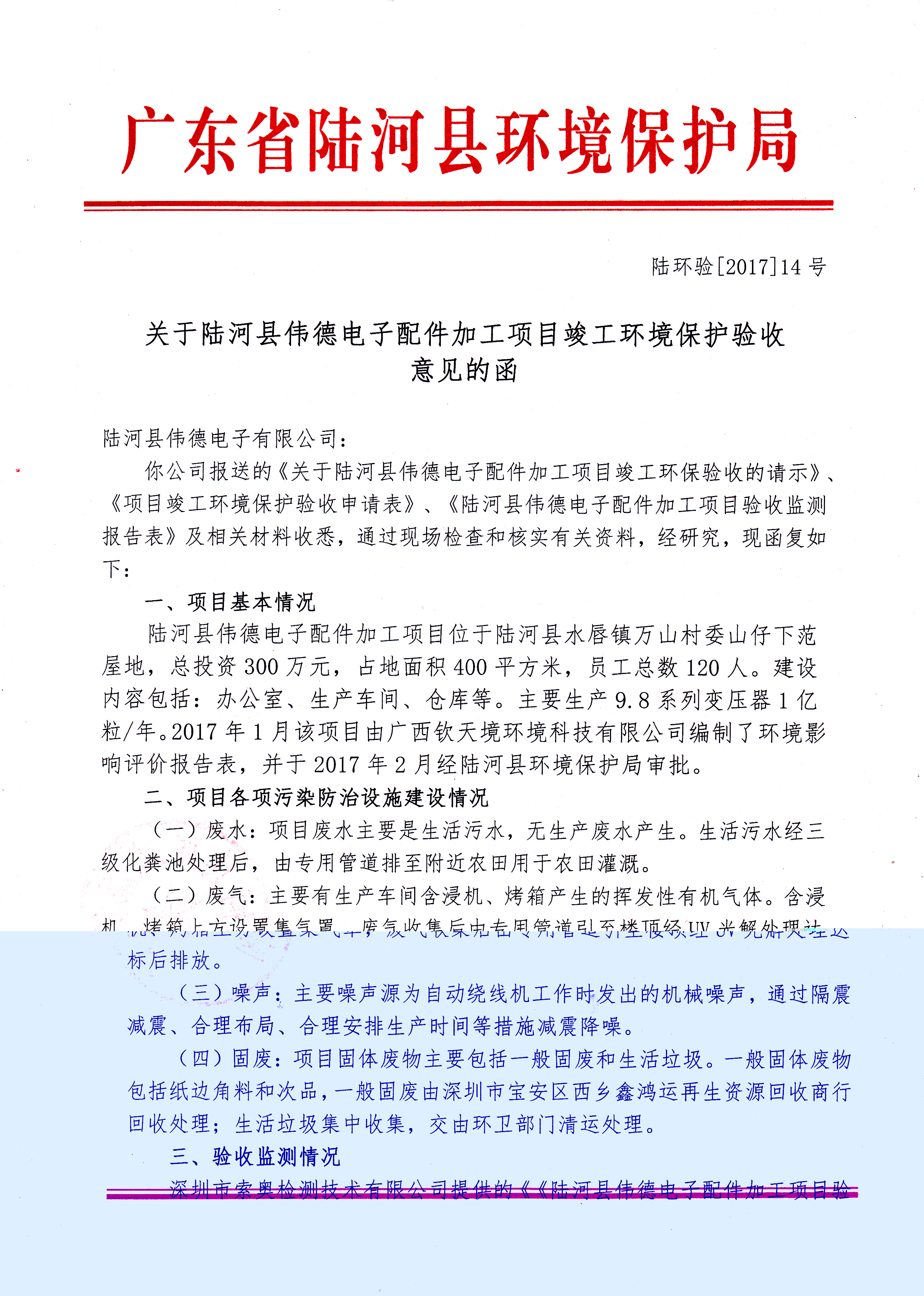 关于陆河县伟德电子配件加工项目竣工环境保护验收意见的公告