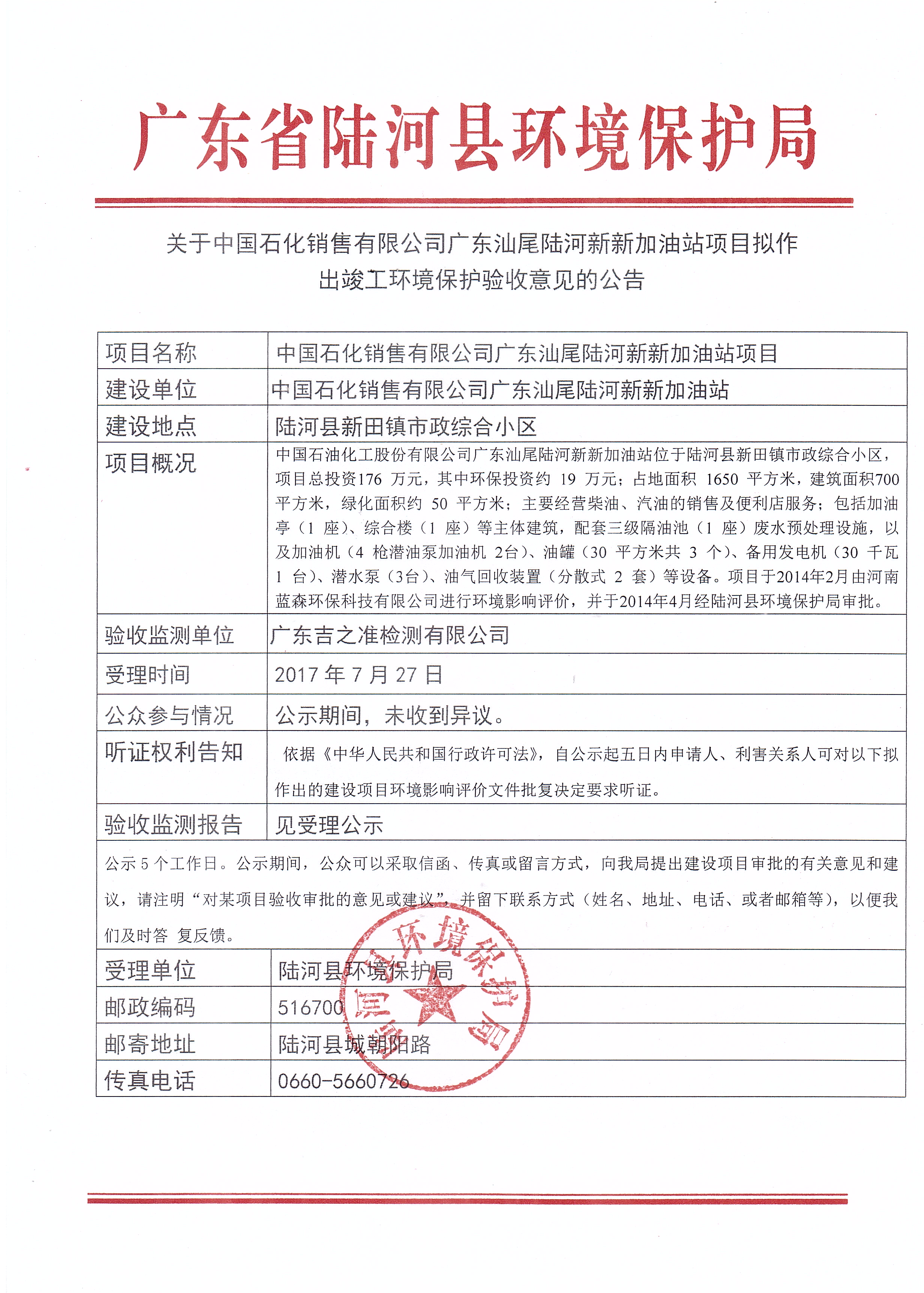 关于中国石化销售有限公司广东汕尾陆河新新加油站项目拟作出竣工环境保护验收意见的公告