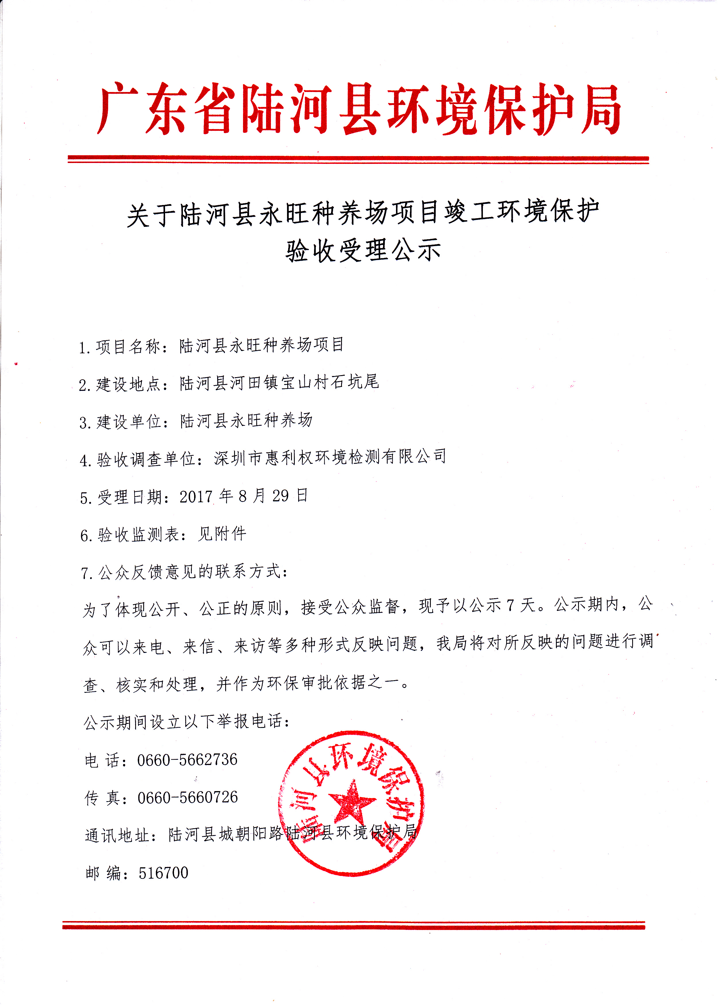 关于陆河县永旺种养场项目竣工环境保护验收受理公示