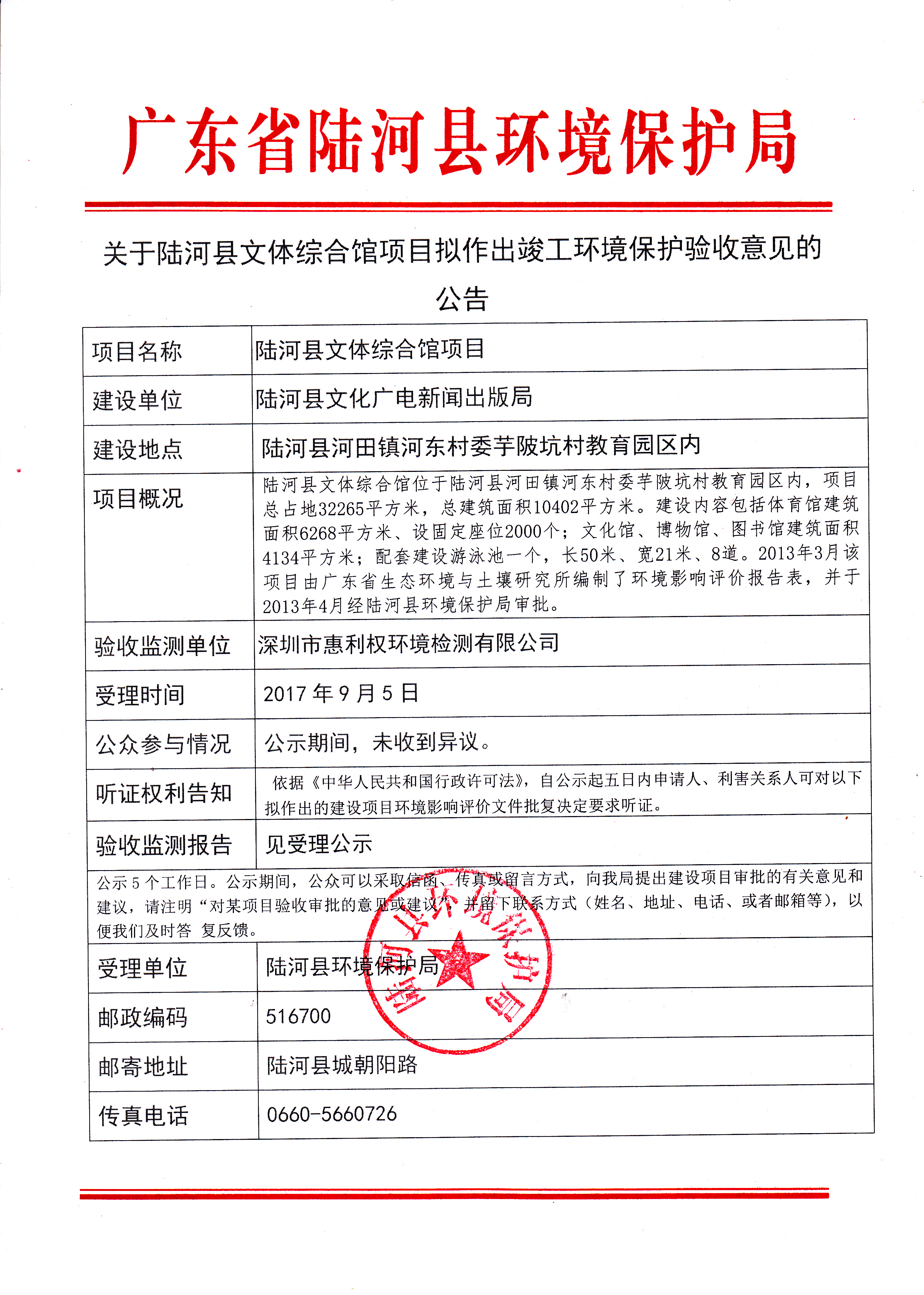 关于陆河县文体综合馆项目拟作出竣工环境保护验收意见的公告