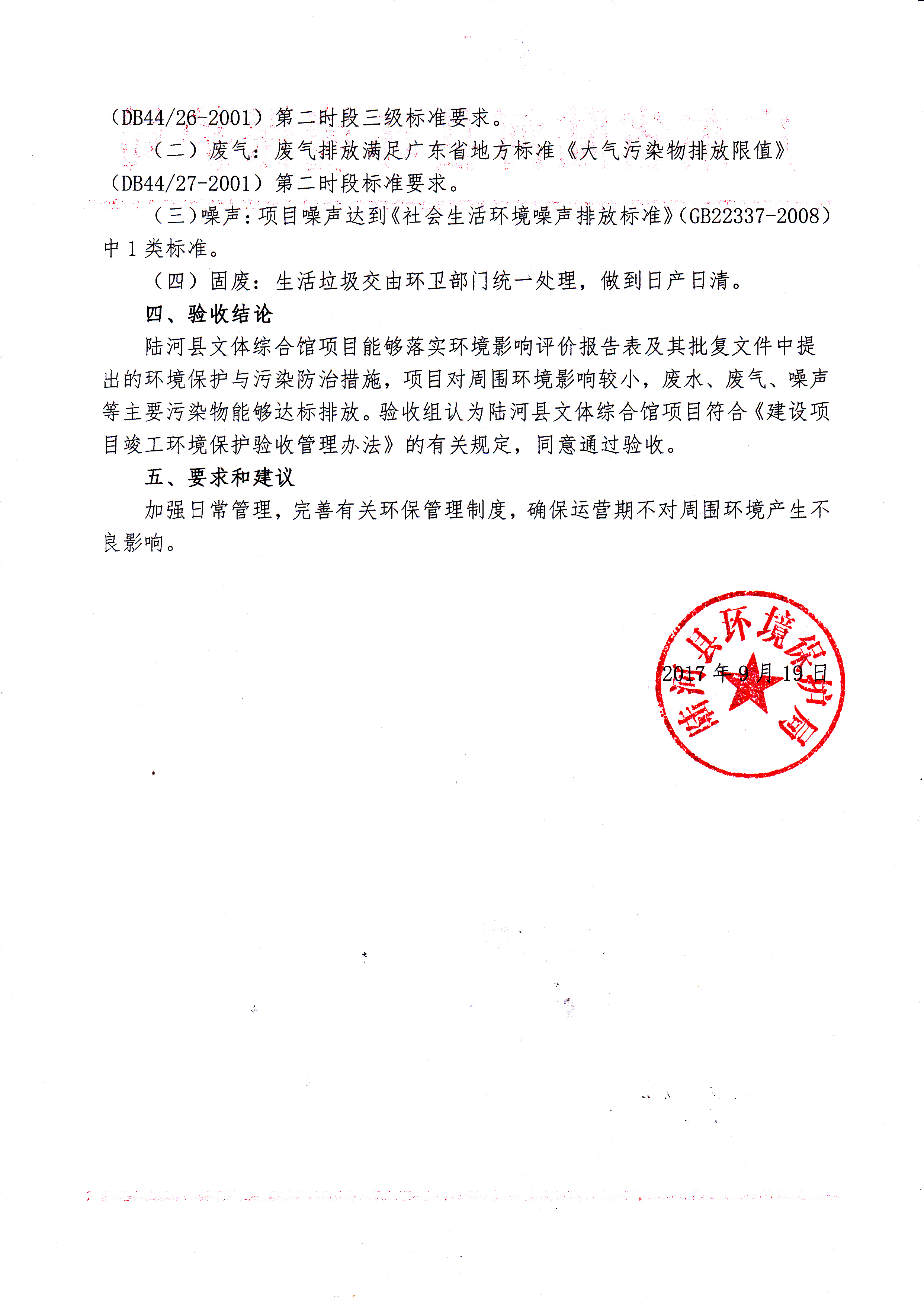 关于陆河县文体综合馆项目竣工环境保护验收意见的函