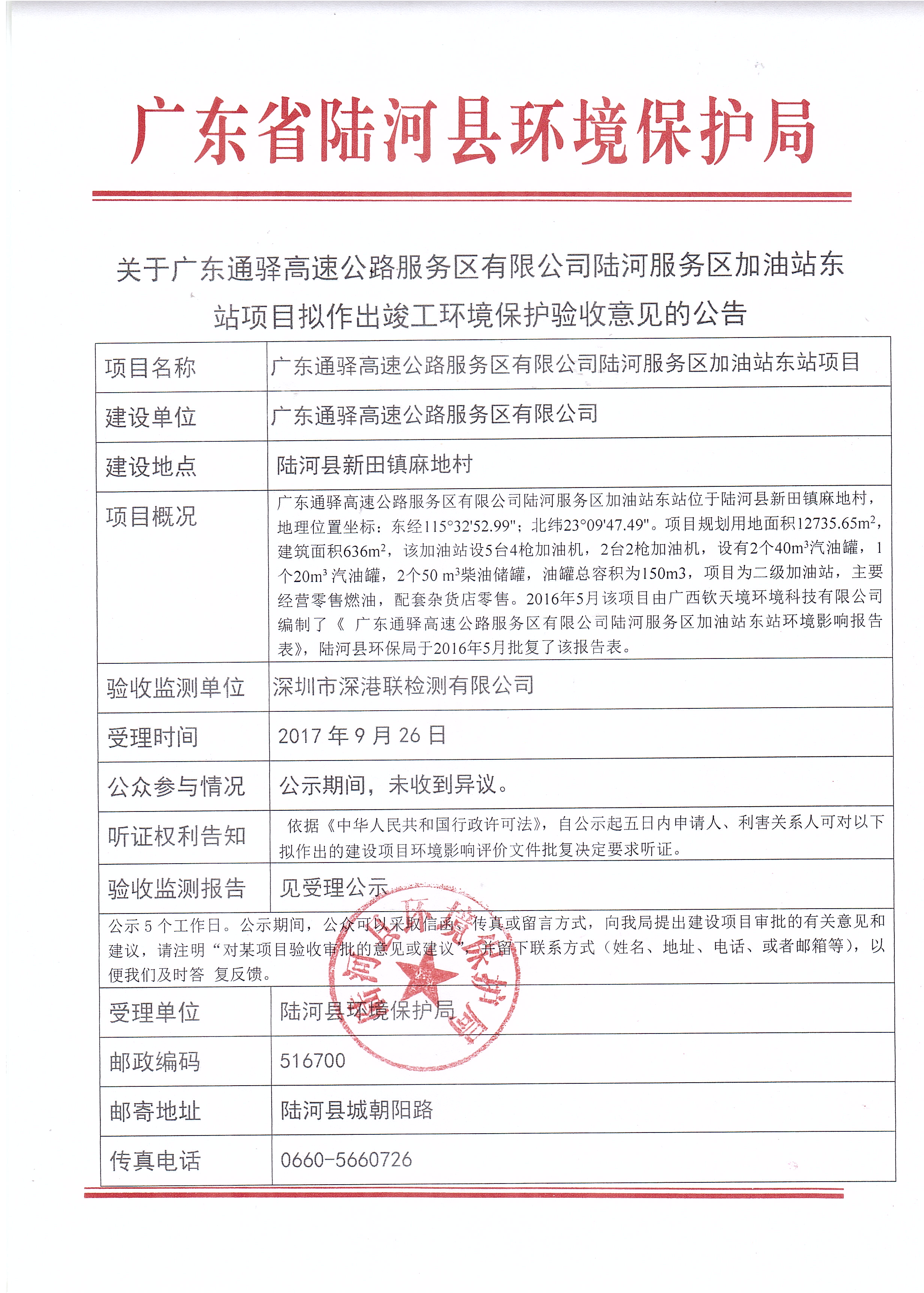 关于广东通驿高速公路服务区有限公司陆河服务区加油站东站项目拟作出竣工环境保护验收意见的公告