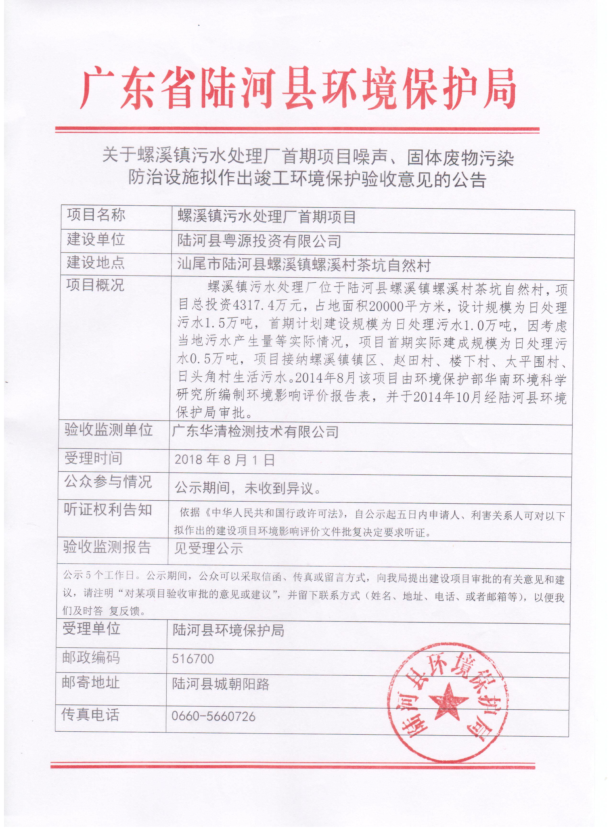 关于螺溪镇污水处理厂首期项目噪声、固体废物污染防治设施拟作出竣工环境保护验收意见的公告