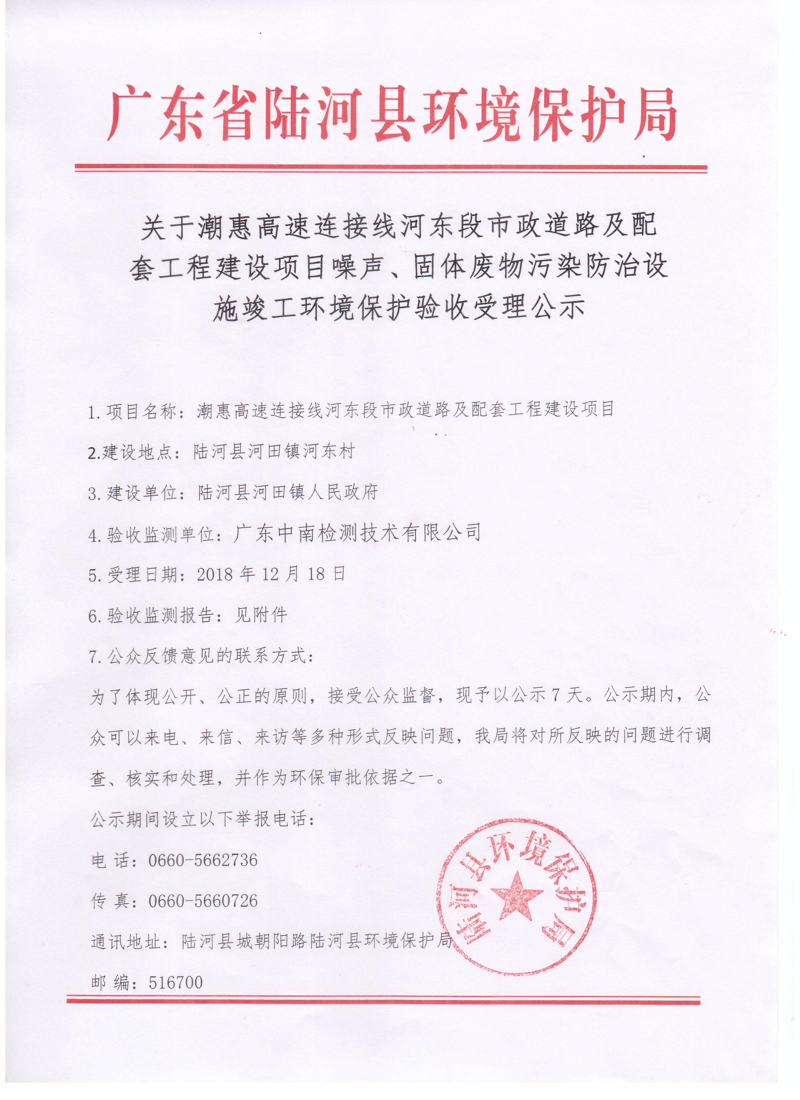 关于潮惠高速连接线河东段市政道路及配套工程建设项目噪声、固体废物污染防治设施竣工环境保护验收受理公示