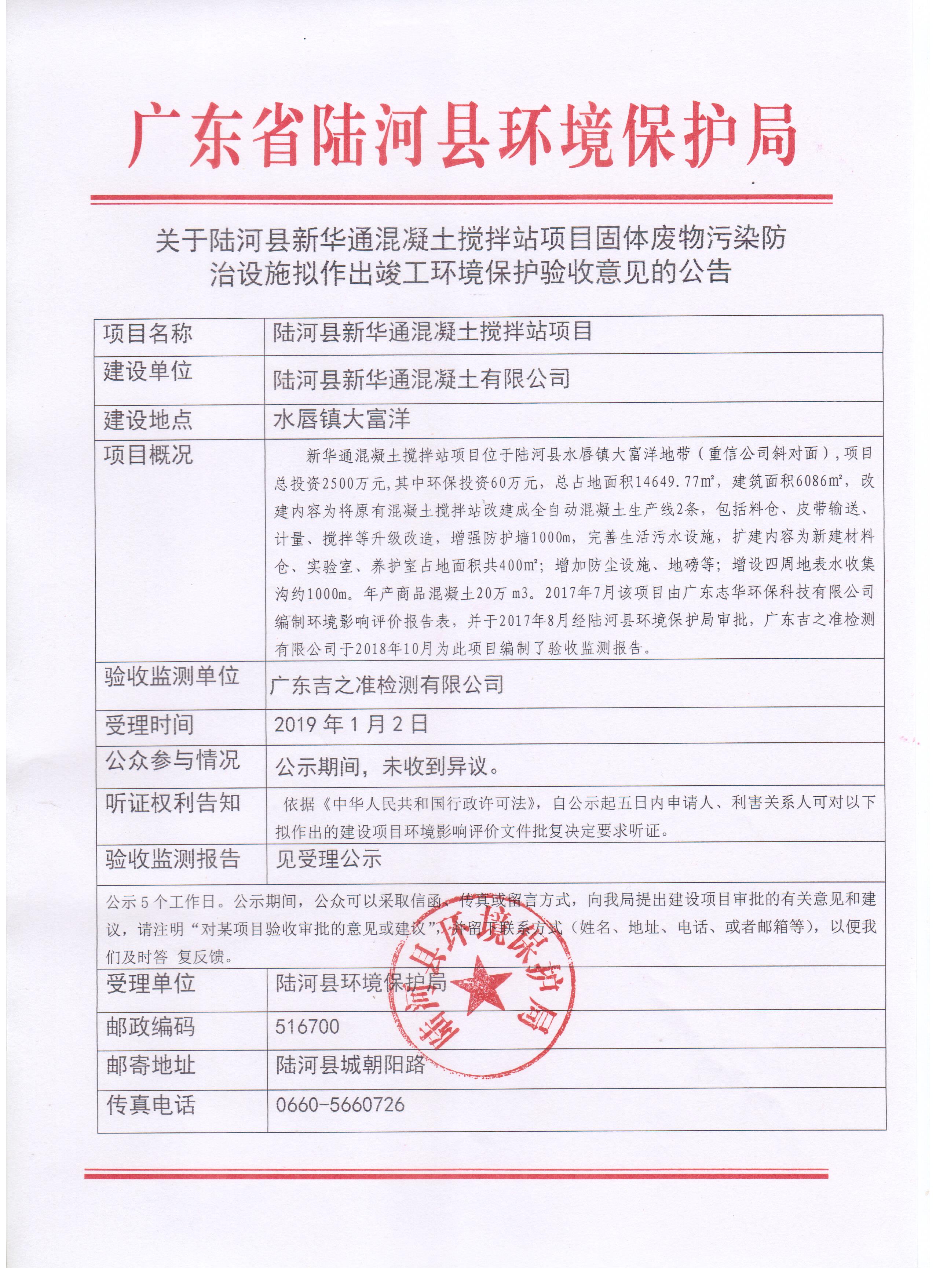关于陆河县新华通混凝土搅拌站项目固体废物污染防治设施拟作出竣工环境保护验收意见的公告