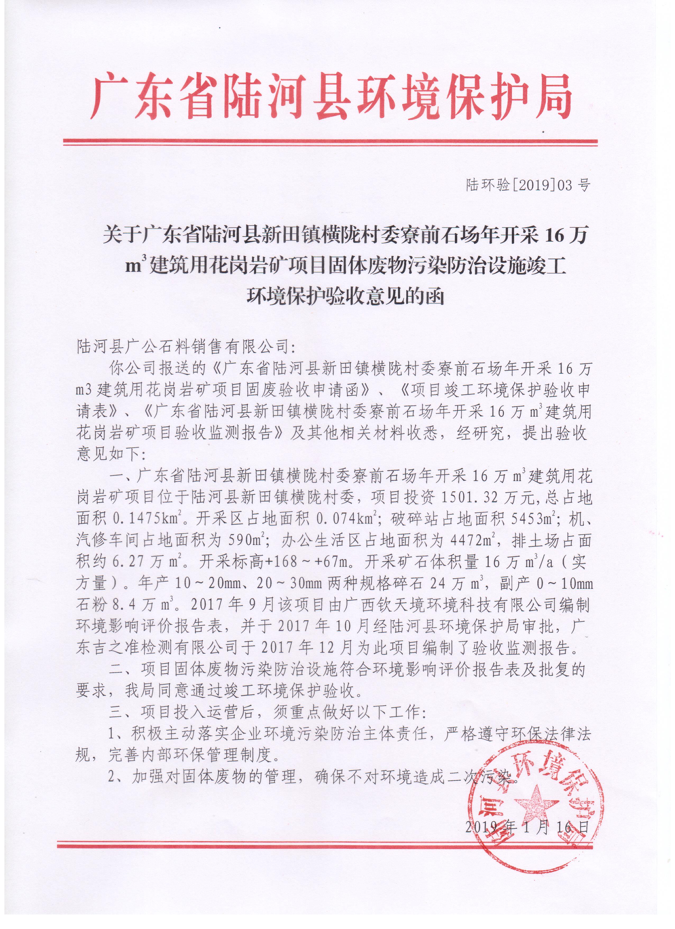 关于广东省陆河县新田镇横陇村委寮前石场年开采16万m3建筑用花岗岩矿项目固体废物污染防治设施竣工环境保护验收意见的函