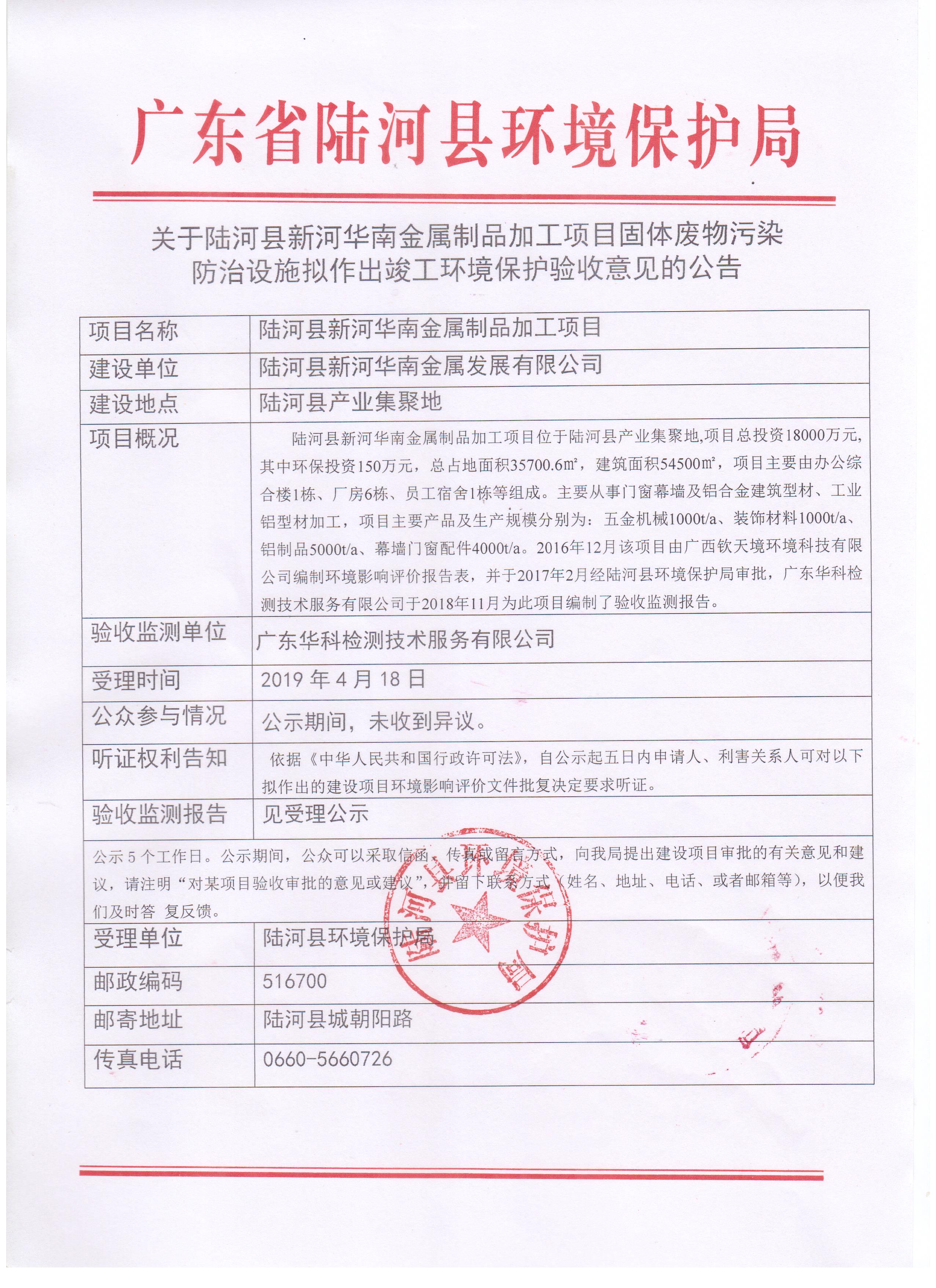 关于陆河伟泰新型建材产业园项目(一期)固体废物污染防治设施拟作出竣工环境保护验收意见的公告