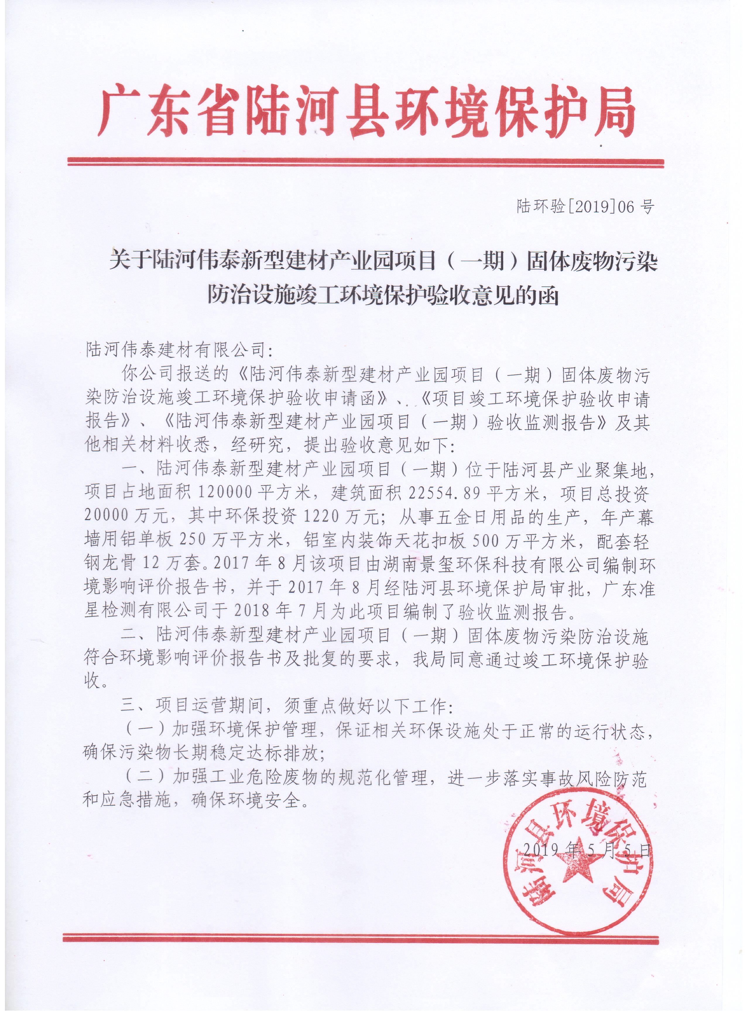 关于陆河伟泰新型建材产业园项目(一期)固体废物污染防治设施竣工环境保护验收意见的函