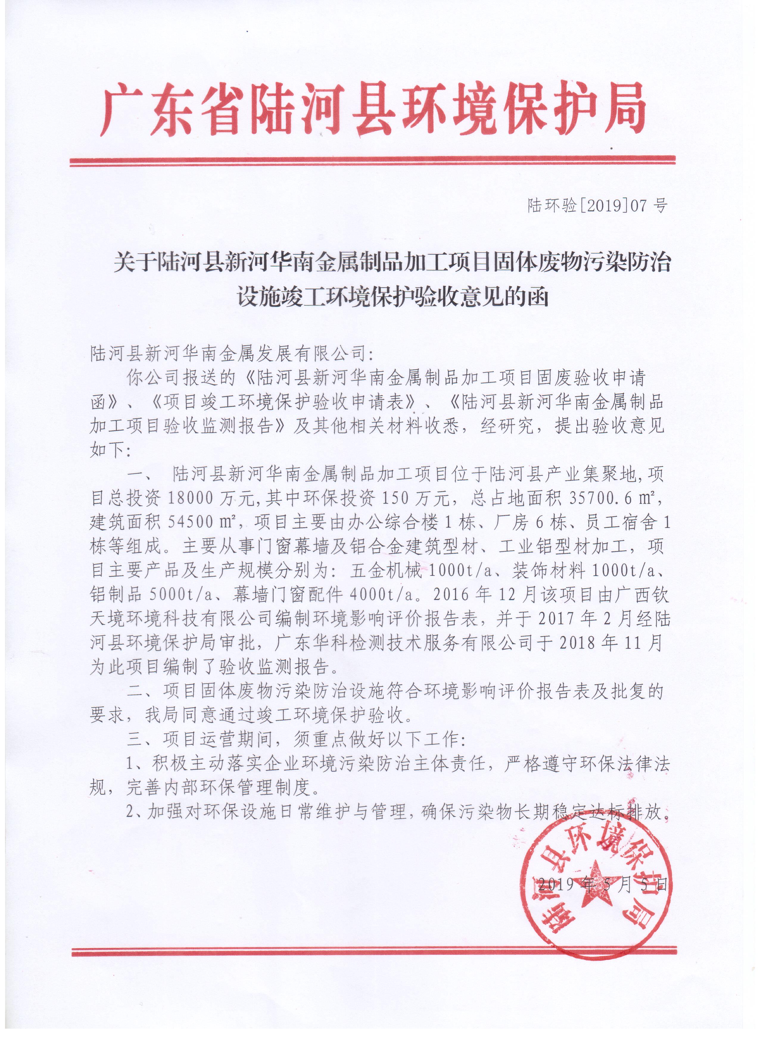 关于陆河县新河华南金属制品加工项目固体废物污染防治设施竣工环境保护验收意见的函