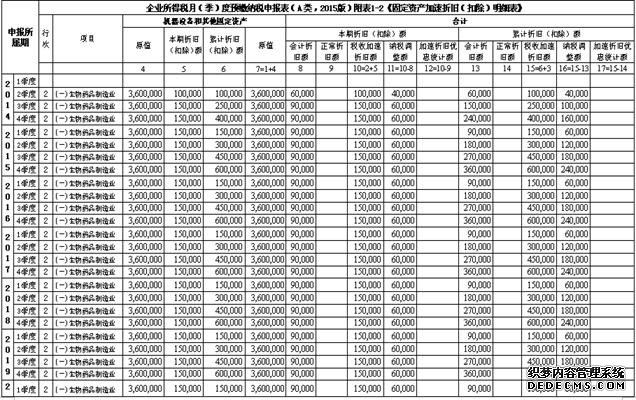 注4:当税收加速折旧额小于按会计折旧额时,不再填写本表的当期数,年度内保留累计数。例三中C企业固定资产税收折旧于2014年3季度预缴申报时一次性税前扣除,2014年4季度预缴申报时,固定资产税收加速折旧额为0,因此2014年4季度的当期数为0,累计数保留至2014年4季度。