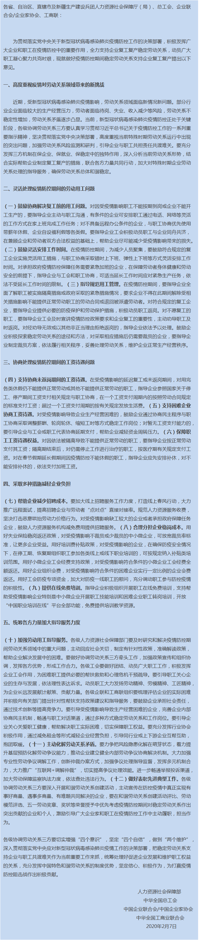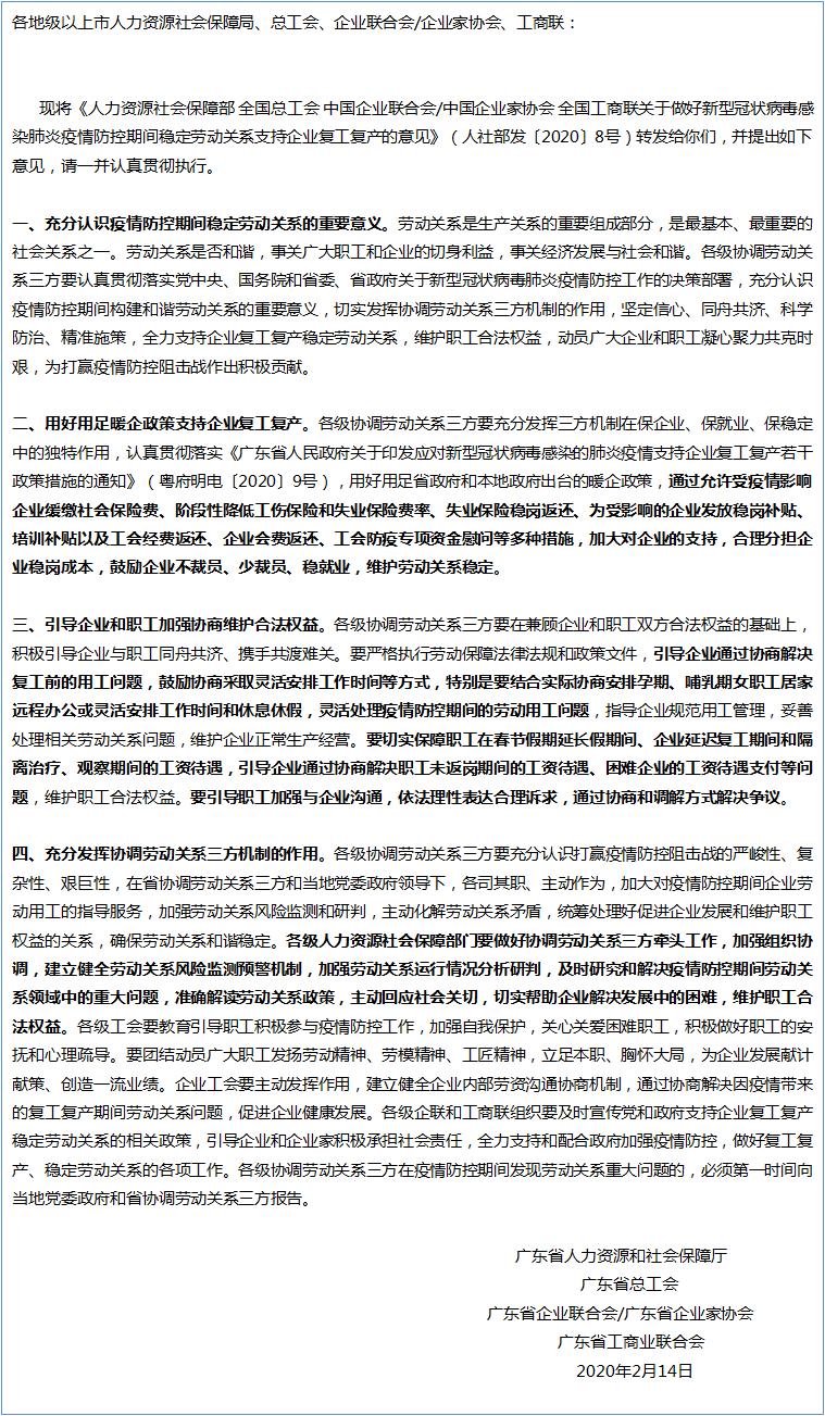 稳定劳动关系支持企业复工复产的意见》原文