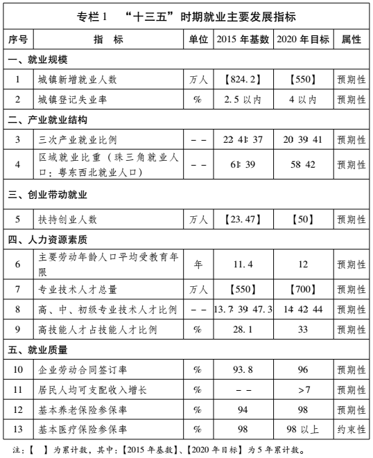 “十三五”时期,全省就业工作要以“四个坚持、三个支撑、两个走在前列”为引领,深入贯彻落实国家“十三五”促进就业规划部署要求,全面实施就业优先战略和人才优先发展战略,强化政策协同和机制创新,着力稳定和扩大就业规模,不断提升就业质量,努力将广东建设成为充分就业先行省、产业就业协同区、创业创新活力区、高素质人力资源集聚区、和谐劳动关系示范区,为稳定全国就业大局作出努力。