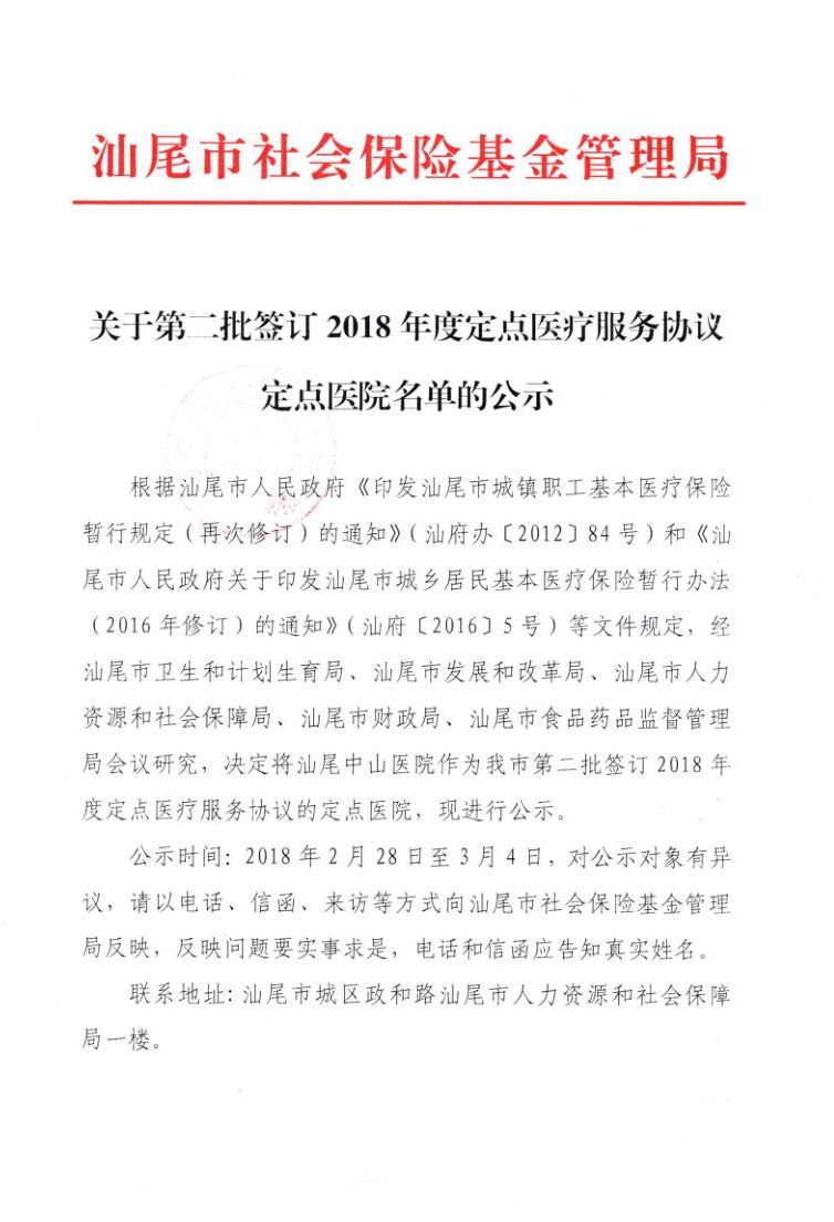 关于第二批签订2018年度定点医疗服务协议定点医院名单的公示