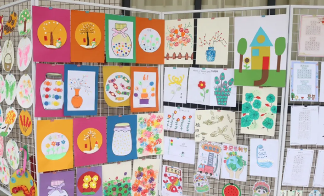 一幅幅色彩鲜艳、主题鲜明的绘画作品挂在展示栏上,内容涵盖自然风光、动植物、节日庆祝等。这些作品不仅展示了孩子们对生活的热爱和对美的追求,还体现了他们在艺术创作中的独特视角和深刻思考。