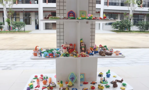 展示架上摆满了孩子们精心制作的手工作品,有栩栩如生的动物、色彩鲜艳的花朵、精美的手工艺品等。每一个作品都凝聚着孩子们的心血和创意,展现了他们丰富的想象力和创造力。