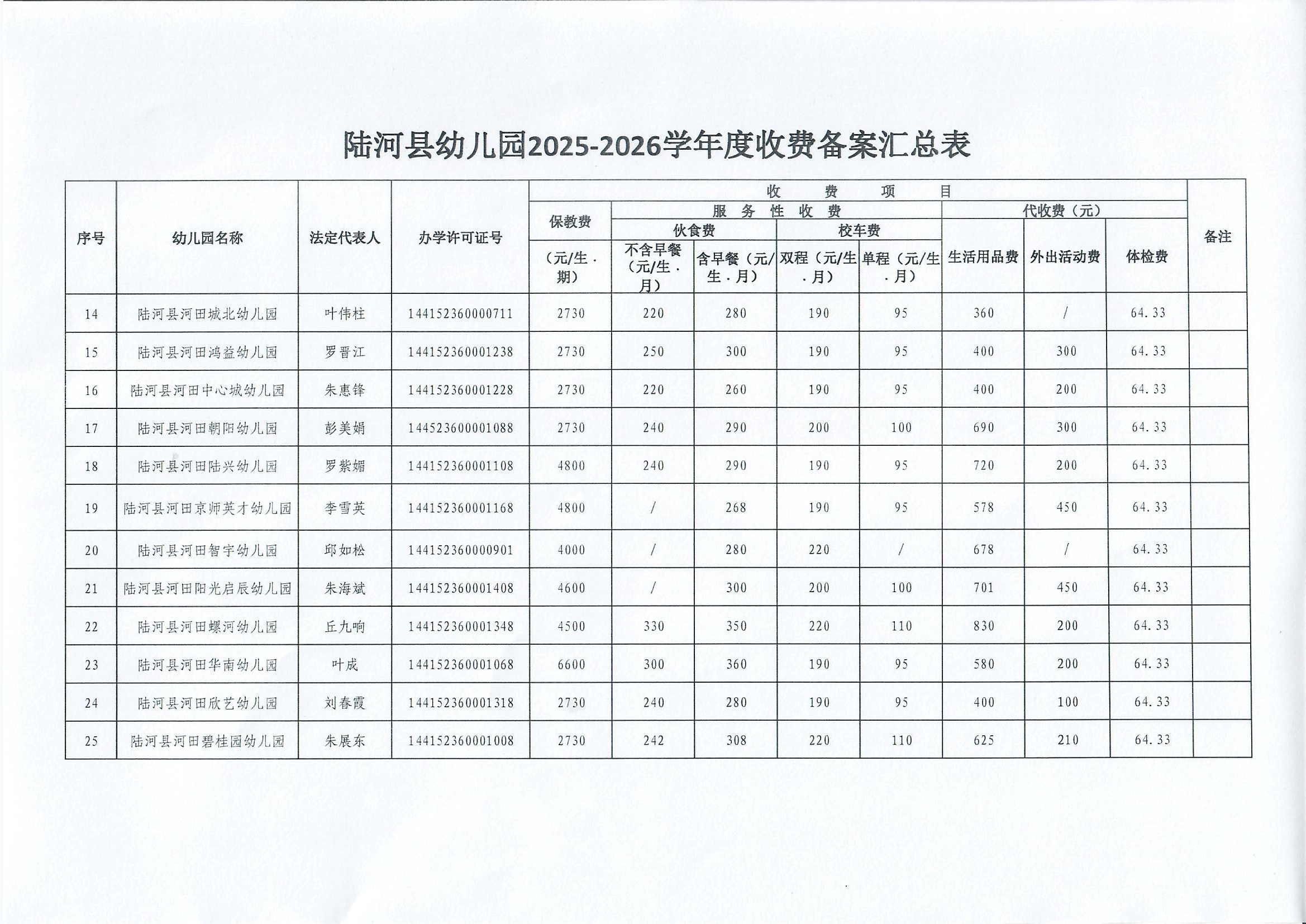 陆河县幼儿园2025-2026学年度收费备案汇总表