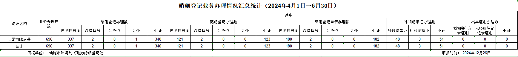 陆河县2024年4-6月婚姻登记业务办理汇总统计