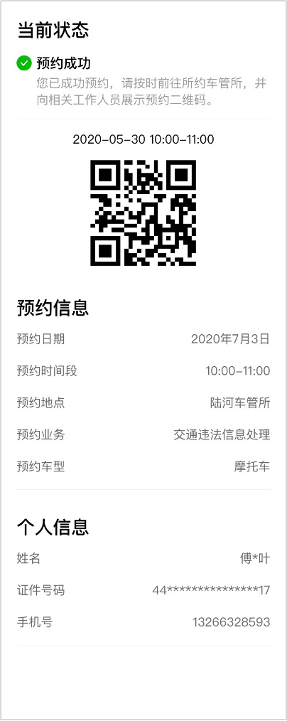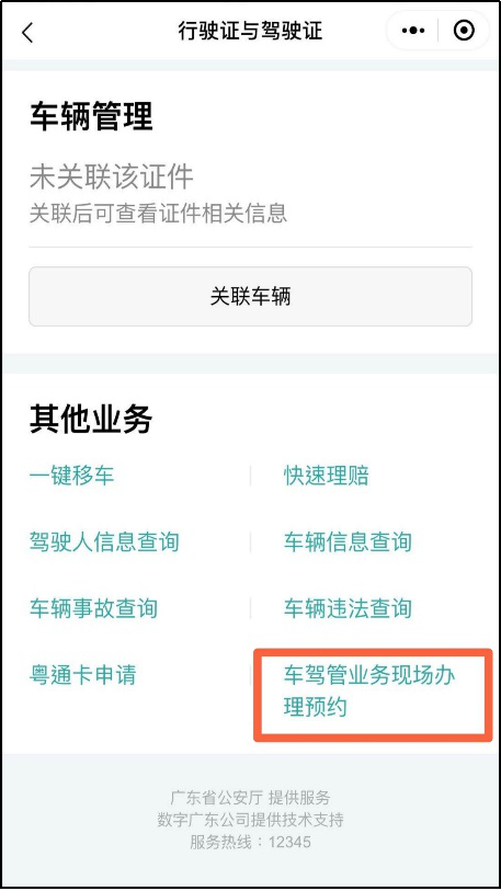 “粤省事”车驾管业务现场办理预约操作指引 一 登录 预约人扫描下方葵花码或打开“粤省事”微信小程序,进入“行驶驾驶”服务,下拉点击“车驾管业务现场办理预约”。 车驾管业务现场办理预约葵花码 二 认证 进入服务界面后,如未进行实名认证,可根据界面相应提示实名认证,当前可选“微信支付密码认证”、“人脸识别认证”两个认证方式。 01 微信支付密码认证 选择微信支付密码登录,点击同意事项,并点击“开始登录”。绑定手机号后,点击“同意授权”,进入下一步。输入微信支付密码,完成登录,如无法登录,请确认是否为本人登录及绑定本人的银行卡。 02 人脸识别认证 选择人脸登录,点击同意事项,并点击“开始登录”。点击下一步进行人脸识别,完成登录。 三 预约 阅读预约须知后,点击“开始预约”进入预约界面,准确填写预约车型、业务、时间、地点等信息,并进行提交。提交成功后,将生成预约二维码。在到达车管所现场后出示预约信息,以供检验员检验预约情况。 温馨提示 1.如选项置灰无法选择,则表示前面所选的条件,在该选项中没有可提供服务的选项,可选择更改前面选项。 2.用户可预约七个工作日内的业务,同一车管所的同一个业务,一个身份证号只能一天内只能预约一次。 3.如所预约的号已过时间,或因客观原因取消该业务以及时间段,则该预约号失效。 4.到市车管所办理业务的群众,驾驶证业务请到3号至11号窗口;车管业务请到19号至23号窗口。 四 查询出示预约情况