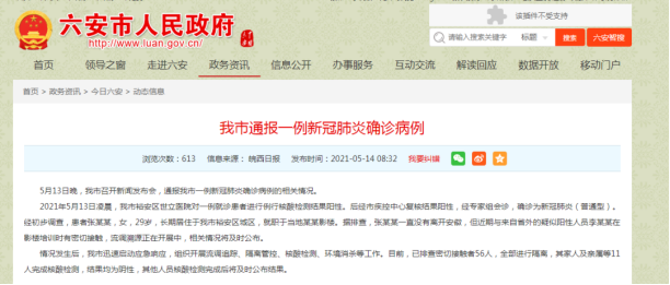 5月13日晚,安徽省六安市召开新闻发布会,通报一例新冠肺炎确诊病例的相关情况。