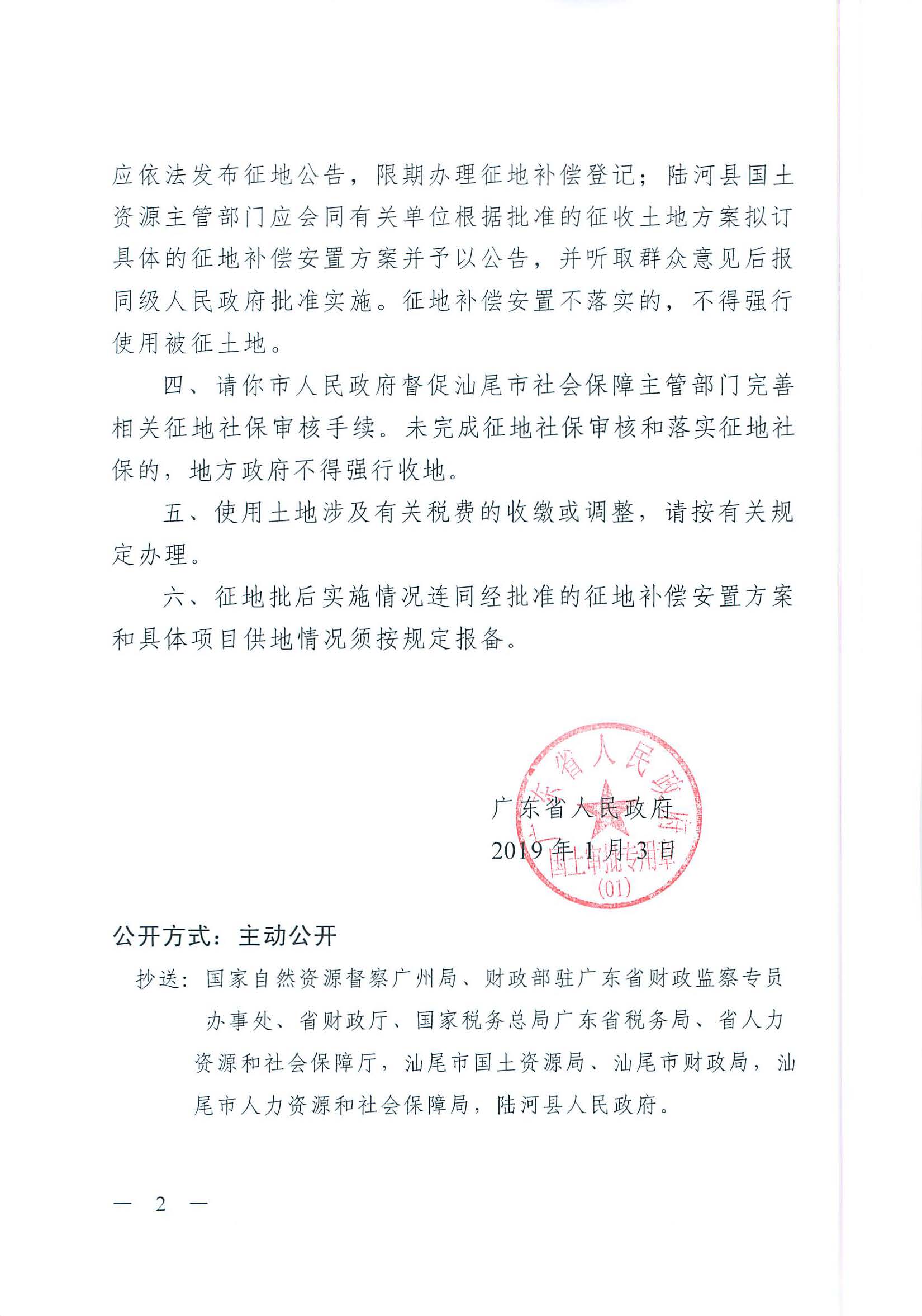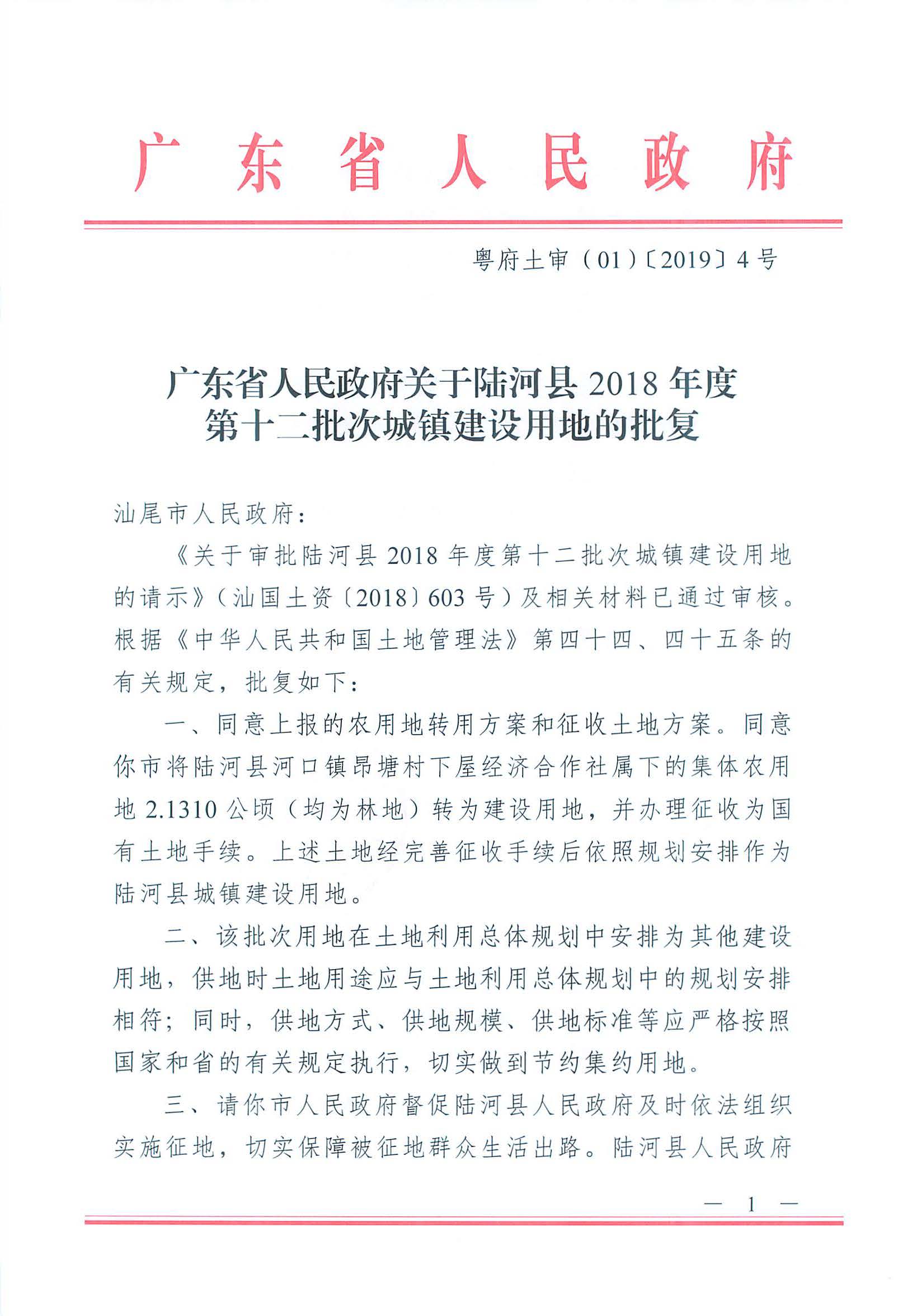 广东省人民政府关于陆河县2018年度第十二批次城镇建设用地的批复