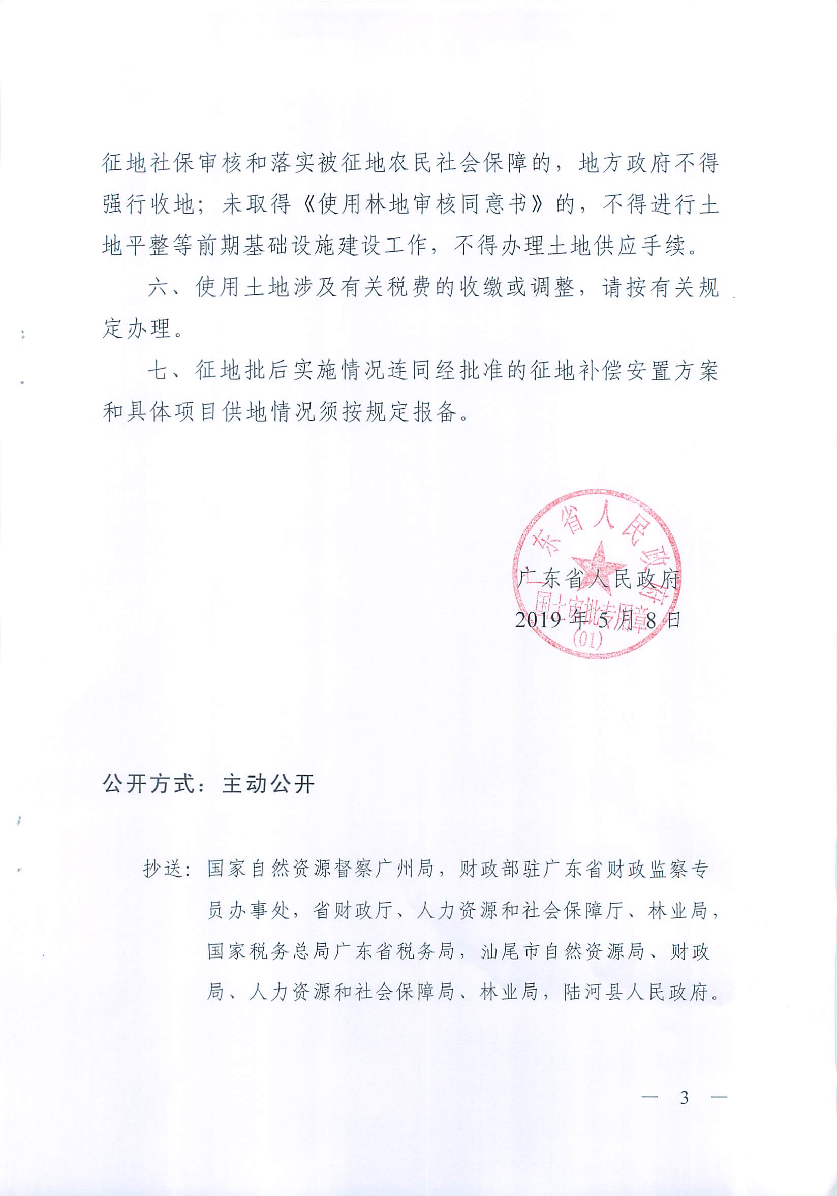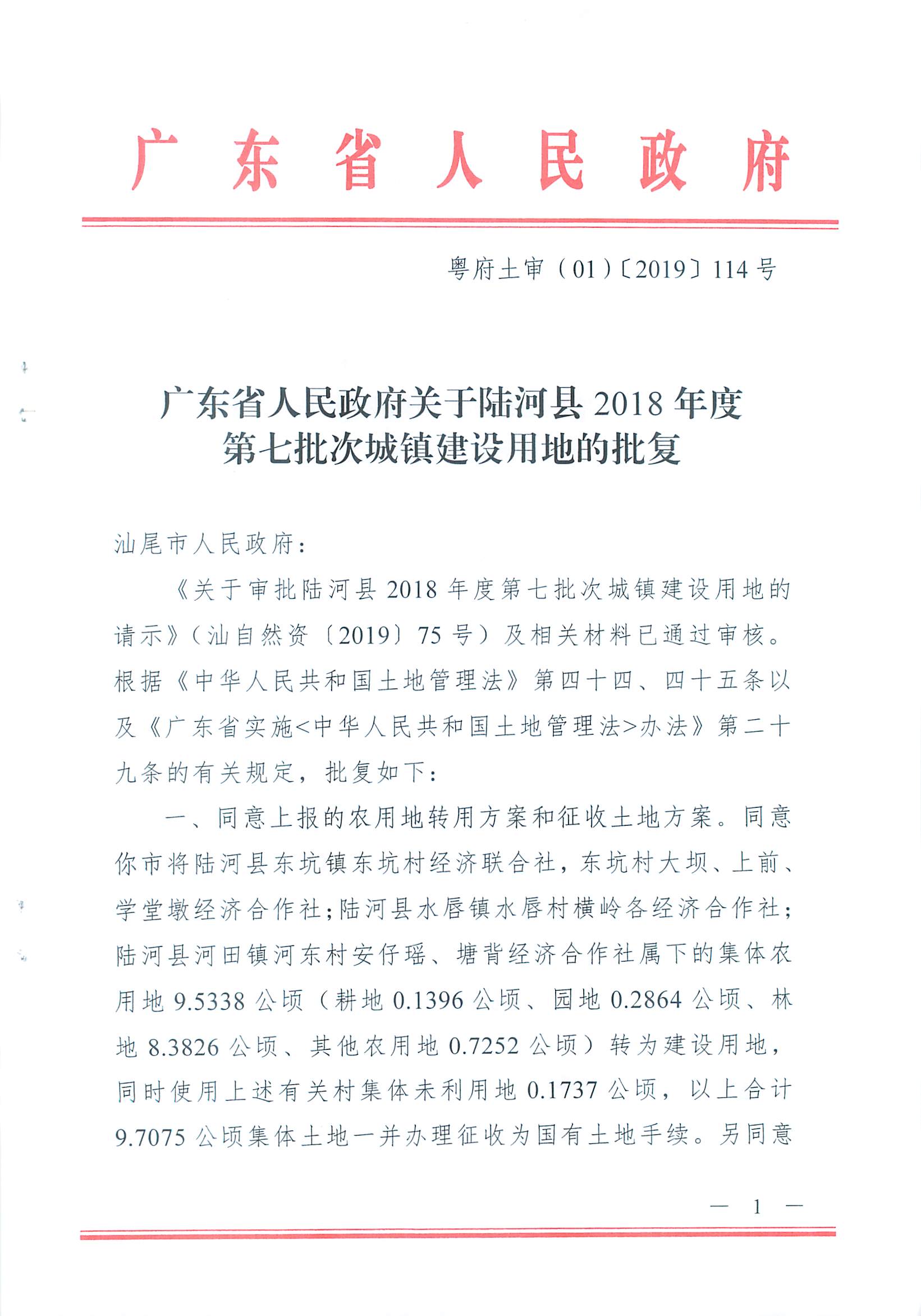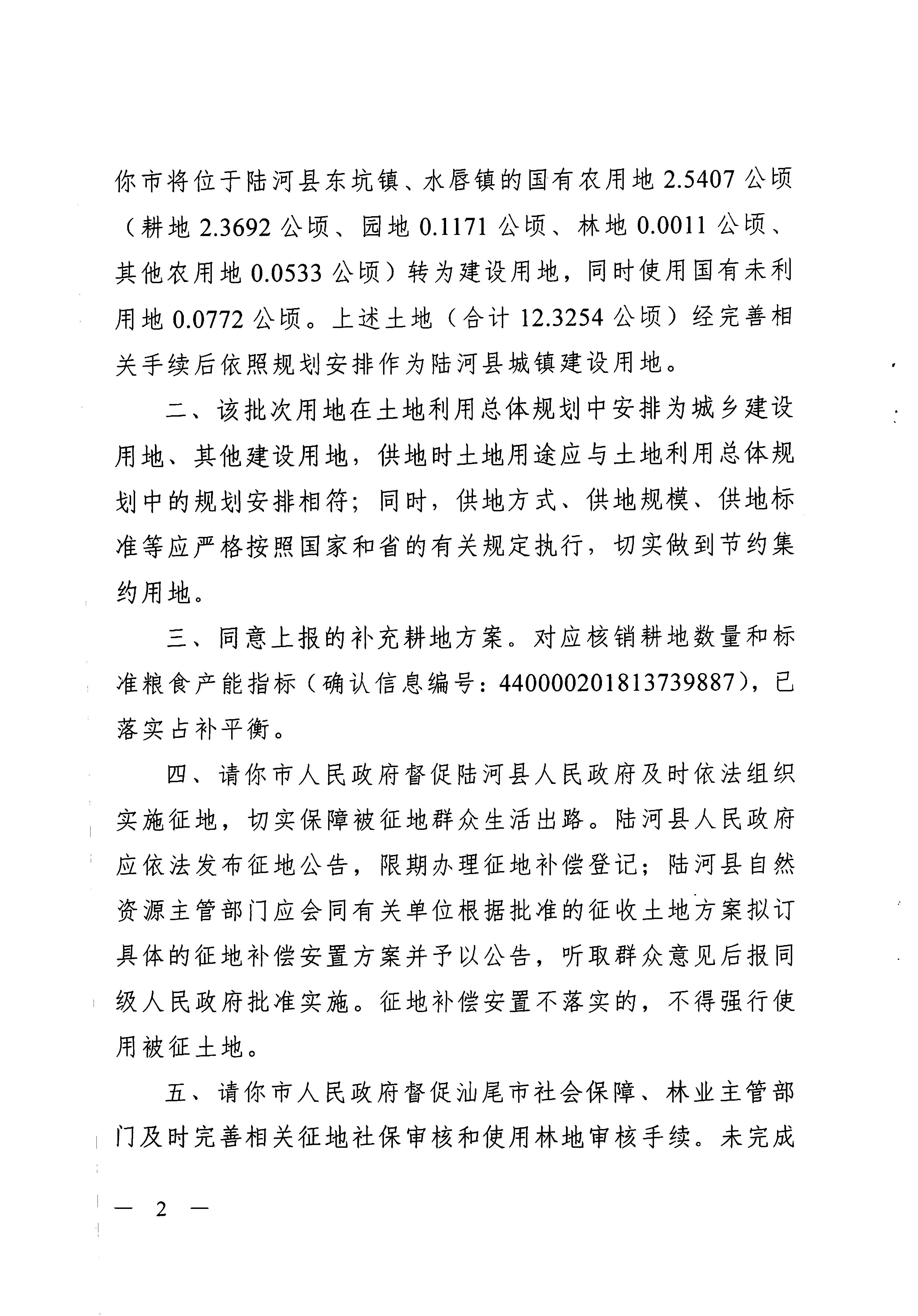 广东省人民政府关于陆河县2018年度第七批次城镇建设用地的批复