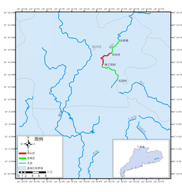 石塔村(N:23°12′51.30″, E:115°43′28.33″),(N:23°12′52.12″, E:115°43′28.85″)至桃子窝村(N:23°15′29.32″N, E:115°40′54.22″),(N:23°15′33.25″, E:115°40′55.58″)江段与东坑村(N:23°17′29.22″N, E:115°42′20.38″),(N:23°17′22.25″, E:115°42′21.45″)至水唇镇(N:23°19′13.68″, E:115°43′27.40″)(N:23°19′12.75″, E:115°43′29.64″)两个江段为实验区。主要保护对象包括:颡鱼、斑鳢、日本鳗鲡、青鱼、草鱼、赤眼鳟、翘嘴红鲌、三角鲂、团头鲂、鳊、光倒刺鲃、鲮、鲤、鲫、鳙、鲢、黄鳝等国家级重点保护的水产种质资源以及黄颡鱼、斑鳢等鱼类产卵场。