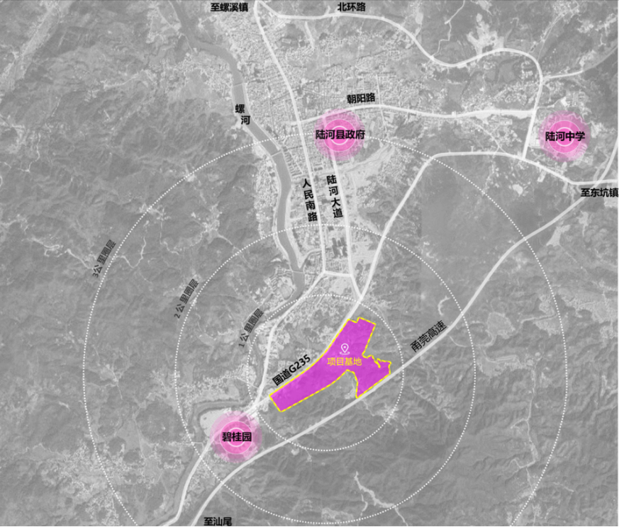 规划区位于陆河县城东部,具体范围东至潮惠高速、西至国道G235、南至原泰安混凝土搅拌站、北至锦兴花木场,规划面积约76.05 公顷。