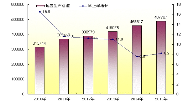 初步核算,2015年全县实现地区生产总值(GDP)487707万元,同比增长8.2%。其中,第一产业增加值102850万元,增长4.3%,对GDP增长的贡献率为9.0%;第二产业增加值95352万元,增长12.6%,对GDP增长的贡献率为49.6%;第三产业增加值289505万元,增长6.7%,对GDP增长的贡献率为41.4%。三次产业结构比为21.1:19.6:59.3。2015年全县人均GDP为16963元,增长7.6%。