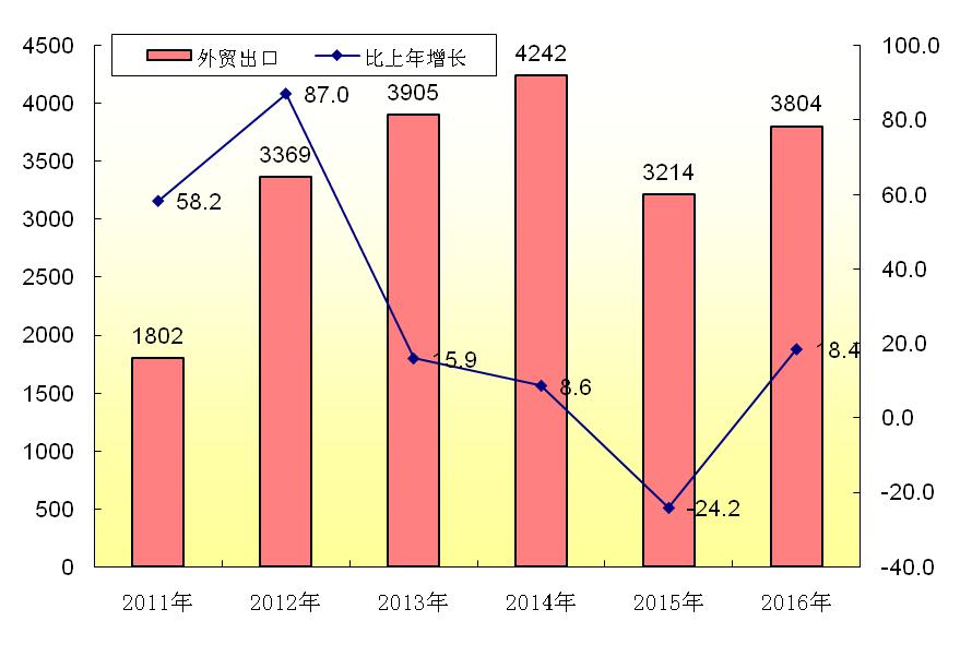 全年完成进出口总额4671万美元。其中,外贸出口总额3804万美元,增长18.4%;外贸进口总额867万美元,下降47.2%。合同利用外资766万美元,下降41.2%。实际利用外商直接投资128万美元,增长195%。