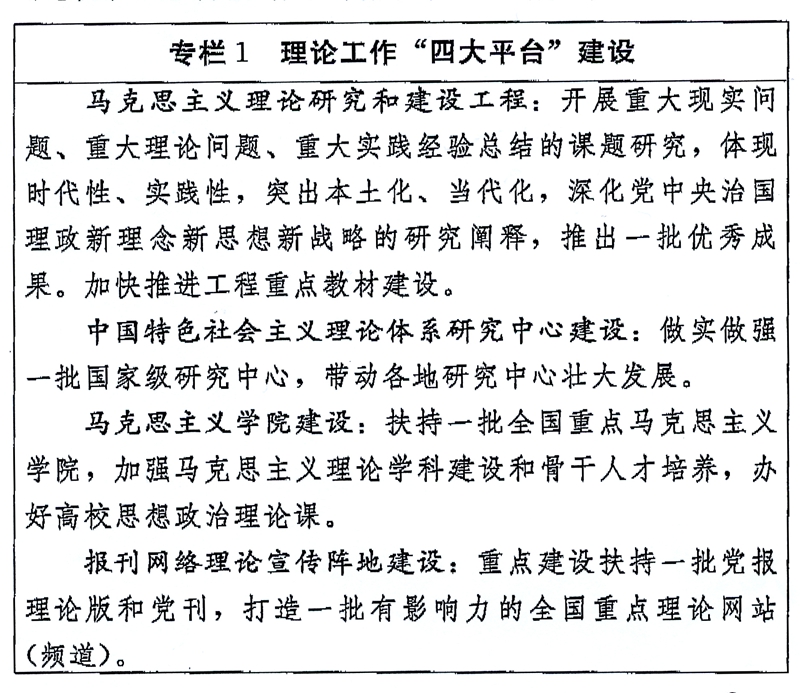 (二)繁荣发展哲学社会科学。坚持马克思主义立场观点方法,按照立足中国、借鉴国外,挖掘历史、把握当代,关怀人类、面向未来的思路,着力构建中国特色哲学社会科学。建立健全哲学社会科学管理体制,加强哲学社会科学创新平台、研究基地、传播中心建设。加强话语体系建设,注重以我为主设置议题,积极开展中国哲学社会科学国际学术研讨活动。举办当代中国马克思主义论坛系列理论研讨会。加强对各类讲座论坛、社科机构的引导和管理。发挥国家哲学社会科学基金示范引导作用,强化考核评价工作。充分发挥中国特色新型智库作用,形成定位明晰、特色鲜明、规模适度、布局合理、能进能出的中国特色新型智库体系。扶持哲学社会科学优秀著作出版。编写哲学社会科学普及读本。