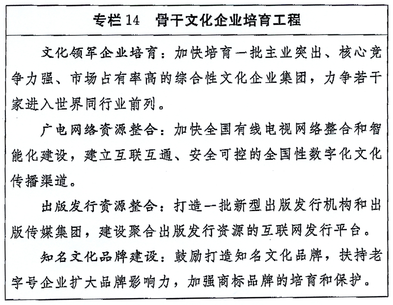 ——现代文化产业体系和现代文化市场体系更加完善,文化市场的积极作用进一步发挥,做优做强做大一批文化企业和文化品牌,文化整体实力和竞争力明显增强,“十三五”末文化产业成为国民经济支柱性产业。