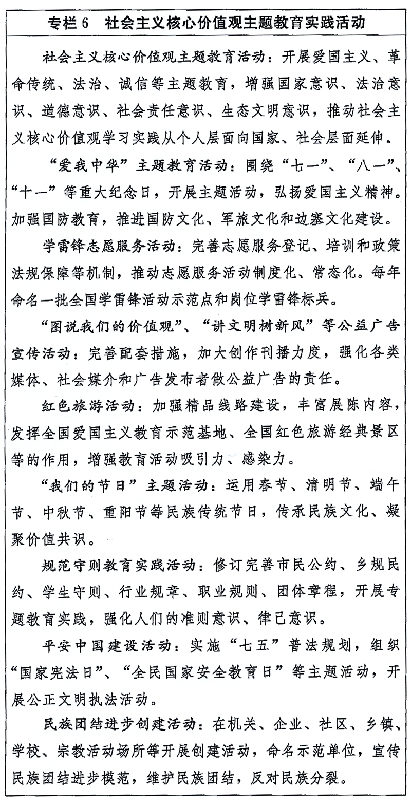(一)推进社会主义核心价值观学习实践具体化系统化。加强对社会主义核心价值观的研究阐释和宣传普及,充分运用各类媒体、文艺作品、公益广告和群众性文化活动等开展主题宣传。强化实践养成,注重典型示范,开展文化培育,精心设计开展多样化的人民群众喜闻乐见的活动。修订和实施爱国主义教育实施纲要,丰富教育内容、创新教育载体,增强中华民族归属感、认同感、尊严感、荣誉感和命运共同体意识。把社会主义核心价值观纳入国民教育体系,增强学生爱国精神、社会责任感和实践创新能力。发扬红色传统、传承红色基因,用好革命历史类纪念设施、遗址和各类爱国主义教育示范基地等红色资源。弘扬社会主义法治精神,把社会主义核心价值观融入法治建设,推动公正文明执法司法,彰显社会主流价值。推动社会治理体现社会主义核心价值观要求,强化公共政策的价值导向,探索建立重大公共政策道德风险评估和纠偏机制。
