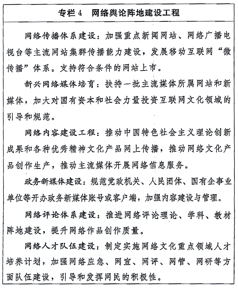 中央网信办、文化部、新闻出版广电总局要根据本规划纲要,抓紧制定本领域的专项规划,报中央文化体制改革和发展工作领导小组批准后实施。国家发展改革委、财政部、国土资源部、商务部、税务总局等要按照职责分工,切实落实有关政策,做好各项重点工程的实施和保障。中央文史馆、国务院参事室等相关部门要积极发挥作用。各地要结合实际,编制好本地区文化发展改革规划。各地区各有关部门要加强对本规划纲要实施情况的跟踪分析和监督检查,推动各项任务措施落到实处。