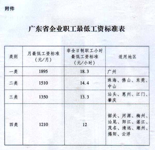 一、从2015年5月1日起,调整我省企业职工最低工资标准和非全日制职工小时最低工资标准,具体标准和适用地区见附件。各地级以上市原则上应统一执行省确定的标准,有条件的地区可在省确定的标准上适当上调标准,并报省人力资源社会保障厅备案。深圳市按《深圳市员工工资支付条例》执行。