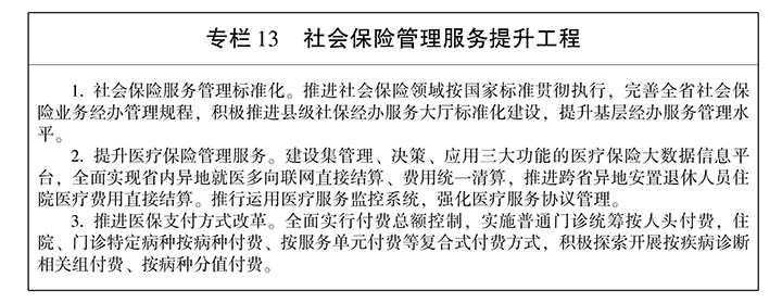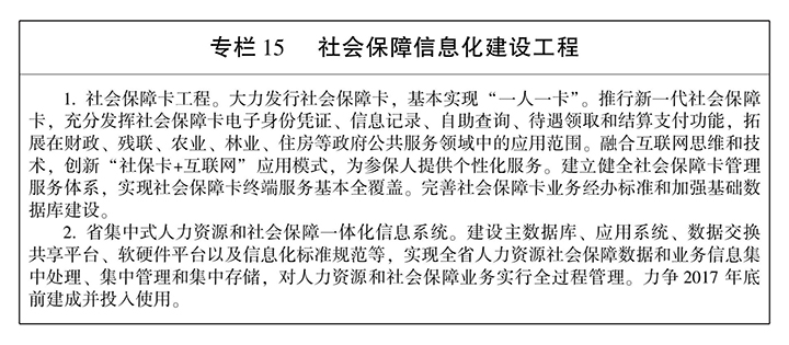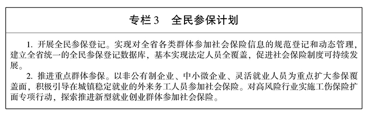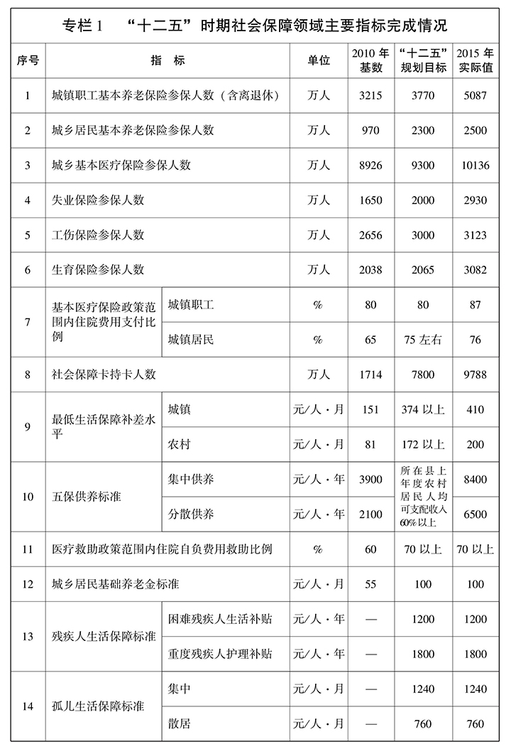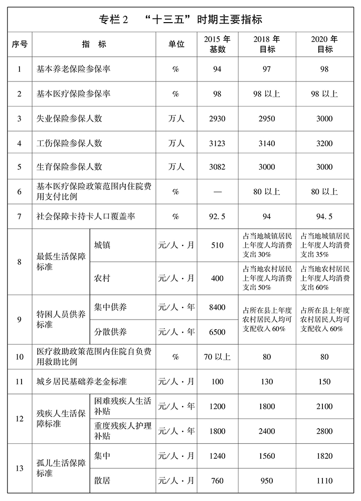 前 言 第一章 贯彻新发展理念 开创社会保障新局面 第一节 发展基础 “十二五”时期,我省认真贯彻落实国家部署,始终把保障改善民生作为根本出发点和落脚点,扎实推动社会保障体系建设取得突破性进展,使人民群众得到更多实惠,社会保障在经济社会发展特别是全面深化改革中更好地发挥了“保障网”和“稳定器”作用,为“十三五”时期发展奠定了坚实基础。 注:孤儿生活保障标准从2011年起实行,困难残疾人生活补贴、重度残疾人护理补贴从2012年起实施。 第二节 指导思想 高举中国特色社会主义伟大旗帜,全面贯彻党的十八大、十八届三中、四中、五中、六中全会精神,以邓小平理论、“三个代表”重要思想和科学发展观为指导,深入贯彻习近平总书记系列重要讲话精神,坚持“五位一体”总体布局和“四个全面”战略布局,牢固树立创新、协调、绿色、开放、共享发展理念,坚守底线、突出重点、完善制度、引导预期,更加注重基本民生保障,以加快基本养老保险和医疗保险城乡一体化为重点,促进基本公共服务均等化;以保障困难群众基本生活为重点,发挥民政兜底功能;以完善残疾人社会保障体系、服务体系和权益保障制度为重点,加快推进残疾人小康进程;进一步增加公共服务供给,激发社会活力,稳步提高社会保障水平,使改革发展成果更多地惠及人民群众,为我省实现“三个定位、两个率先”目标提供有力支撑。 第三节 基本原则 ——坚持促进公平与提高效率相结合。充分发挥社会保障二次分配功能,推进社会保障城乡一体化发展,实现权利公平、机会公平、规则公平。注重发展多层次社会保障制度体系,加快推进制度衔接融合,进一步完善筹资模式和管理服务体系,不断提高社会保障制度运行效率。 第四节 发展目标 以保基本、兜底线、促公平、可持续为准则,加快建立健全更加公平、可持续的社会保障制度,不断提高社会保障水平,为我省率先全面建成小康社会构建更高水平的社会保障网。 第二章 坚持城乡统筹 加快推进社会保险城乡一体化 坚持全覆盖、保基本、多层次、可持续的方针,以推进养老、医疗保险城乡一体化为重点,构建法定人员全覆盖、保障待遇水平适度、基金运行安全稳定、管理服务高效便捷、权益更加均衡的社会保障网。 第一节 实现社会保险法定人员全覆盖 完善参保缴费激励政策。推进供给侧结构性改革,研究建立社会保险费率动态调整机制,适时适度降低社会保险费率。完善灵活就业人员、个体从业人员、被征地农民等群体参保政策,健全城乡居民养老、基本医疗保险连续参保激励机制,鼓励积极参保、持续缴费。 第二节 完善养老保险省级统筹 按照国家统一部署要求,进一步规范和完善养老保险省级统筹,对接基础养老金全国统筹。统筹调控全省企业养老保险单位缴费比例,进一步均衡不同地区企业的养老保险缴费水平,积极调整财政支出结构,不断增强基金的支撑能力。逐步提高企业职工基本养老保险基金统筹力度,通过改革完善省级养老保险调剂办法,强化省级调剂金分配的激励约束机制,充分调动各方面工作积极性。分阶段提高省级调剂金上缴比例,2017年提高至14%,2018年提高至16%,2020年提高至20%并实现养老保险基金省级统收统支。 第三节 推进养老保险城乡一体化 探索养老保险城乡一体化。在国家现行企业职工养老保险和城乡居民养老保险两项基本制度框架基础上,逐步缩小制度差异,探索建立城乡一体化的基本养老保险制度体系,实现养老保险关系城乡间顺畅转移接续。鼓励和引导有缴费能力的城乡居民按灵活就业人员政策参加职工养老保险,加快推进养老保险城乡一体化。 第四节 推进医疗保险城乡一体化 探索建立城乡一体化基本医疗保险制度。整合城镇职工基本医疗保险和城乡居民基本医疗保险制度,消除职业和身份差异,建立城乡一体、层次多元、公平和谐、惠民高效的社会医疗保险,统一覆盖范围、筹资标准、待遇水平、基金管理和经办服务,健全涵盖住院、门诊特定病种、普通门诊和大病保险的医疗保障体系。优化整合大病保险政策,完善委托管理和风险分担机制。推进生育保险和基本医疗保险合并实施。 第五节 完善工伤失业保险制度 全面完善工伤保险制度。按照国家统一部署,制订公务员和参照公务员法管理事业单位工作人员工伤保险政策,健全差别化、可浮动的工伤保险费率政策。巩固完善工伤保险市级统筹,加快推进省级统筹。建立健全工伤预防长效机制,完善工伤康复管理制度和标准体系。强化以职业康复为重点的工伤康复服务,降低工伤事故、职业病等发生率。 第六节 确保社保基金安全可持续运行 拓宽社会保险基金筹资渠道。坚持精算平衡,完善筹资机制,分清政府、企业、集体、个人责任。探索建立划转部分国有资本充实社保基金机制,增强基金支撑能力。全面落实养老保险基金投资管理办法,完善其他险种社会保险基金投资保值措施,研究制订基金投资运营监督管理办法,加强风险管理,提高投资回报率。完善企业年金、职业年金市场化运营法规政策、监管机制和治理结构,加强市场监管,规范管理行为,防范运行风险。 第七节 发展补充保险 在建立健全各项基本社会保险制度的基础上,针对多元化的社会保障需求,落实和完善税收支持政策,鼓励发挥商业保险补充