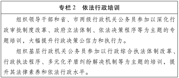 二、培训内容 (一)理想信念教育。深入开展马克思列宁主义、毛泽东思想、邓小平理论、“三个代表”重要思想、科学发展观教育,特别是习近平总书记系列重要讲话精神培训。加强党的路线方针政策、社会主义核心价值观、党史国史、国情省情教育,引导广大公务员坚定共产主义理想信念,增强中国特色社会主义道路自信、理论自信、制度自信、文化自信。切实增强政治意识、大局意识、核心意识、看齐意识,自觉地在思想上、行动上同以习近平同志为核心的党中央保持一致,坚决维护党中央的权威。提高运用马克思主义立场、观点、方法分析解决问题的能力和水平。在行政机关公务员队伍中大力弘扬广东“敢为人先、敢闯敢试”的改革开拓精神,牢固树立公仆意识,增强工作主动性。 (二)职业道德教育。深入开展以“坚定信念、忠于国家、服务人民、恪尽职守、依法办事、公正廉洁”为主要内容的公务员职业道德培训,将职业道德教育作为公务员初任、任职、在职培训的必修内容,纳入各级行政学院等培训机构课程,确保在“十三五”期间完成对全省行政机关公务员的轮训,使行政机关公务员具备良好的职业操守和高尚的精神追求。 (三)履职素质能力。加强创新、协调、绿色、开放、共享发展理念和供给侧结构性改革、创新驱动发展战略、区域协同发展理论等培训,强化财税、金融体制改革等领域新知识培训,积极开展政府治理与服务、新型城镇化、应急管理、舆情应对、大数据思维、网络安全与保密、精准扶贫、安全生产等方面的培训,提高公务员施政能力和服务水平。广泛开展哲学、历史、科技、文学、艺术和国防外交、民族宗教、心理健康等方面培训,提升个人综合修养。支持行政机关公务员参加在职学历学位教育、与本职工作直接相关的职业资格培训。 (四)依法行政能力。围绕珠三角地区各级政府2018年率先建成法治政府、全省2020年基本建成法治政府的目标,加强中国特色社会主义法治道路、法治理论、法治体系的培训。突出宪法培训,强化国家基本法律、与经济社会发展和人民生产生活密切相关法律法规、与履行岗位职责密切相关法律法规的培训。加强依法决策、依法履职的培训,确保法定职责必须为、法无授权不可为。全面提升公务员法治思维,增强深化改革、推动发展、化解矛盾、维护稳定的能力。继续加强公务员法等法律法规培训,提高公务员管理法治化水平。