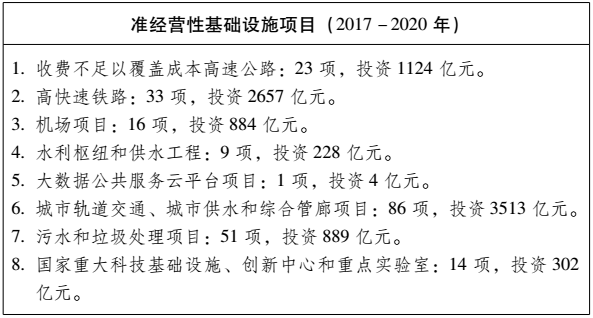 (二)积极发挥政府引导作用推进准经营性项目建设。2017-2020年,对经营收费不足以覆盖投资成本、仅靠市场难以达到供求平衡、需政府补贴部分资金或资源的准经营性项目投资约9600亿元,共233项。此类项目作为深入推进基础设施供给侧结构性改革的工作重点,积极推广政府和社会资本合作模式,设立基础设施投资基金,发挥政府投资撬动作用,激发社会资本活力,引导社会资本共同参与基础设施建设。