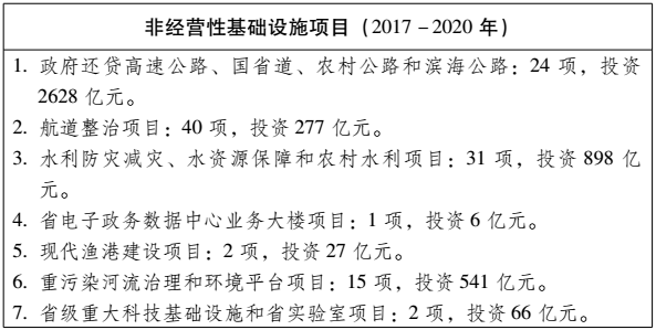 (三)更好发挥政府主导作用推进非经营性项目建设。2017-2020年,对缺乏“使用者付费”基础、主要依靠“政府付费”回收投资成本的非经营性项目投资约4400亿元,共115项。此类项目由政府兜底,按项目隶属关系纳入本级政府财政预算,坚决履行提供公共产品有效供给的义务。同时鼓励社会资本参与,有效提供公共产品。