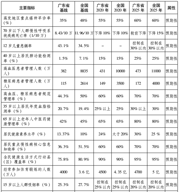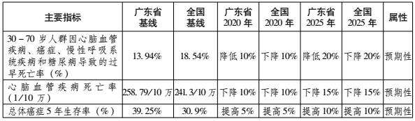 到2020年,慢性病防控环境显著改善,降低因慢性病导致的过早死亡率,力争30-70岁人群因心脑血管疾病、癌症、慢性呼吸系统疾病和糖尿病导致的过早死亡率较2015年降低10%。到2025年,慢性病危险因素得到有效控制,实现全人群全生命周期健康管理,力争30-70岁人群因心脑血管疾病、癌症、慢性呼吸系统疾病和糖尿病导致的过早死亡率较2015年降低20%。逐步提高居民健康期望寿命,有效减轻慢性病疾病负担。