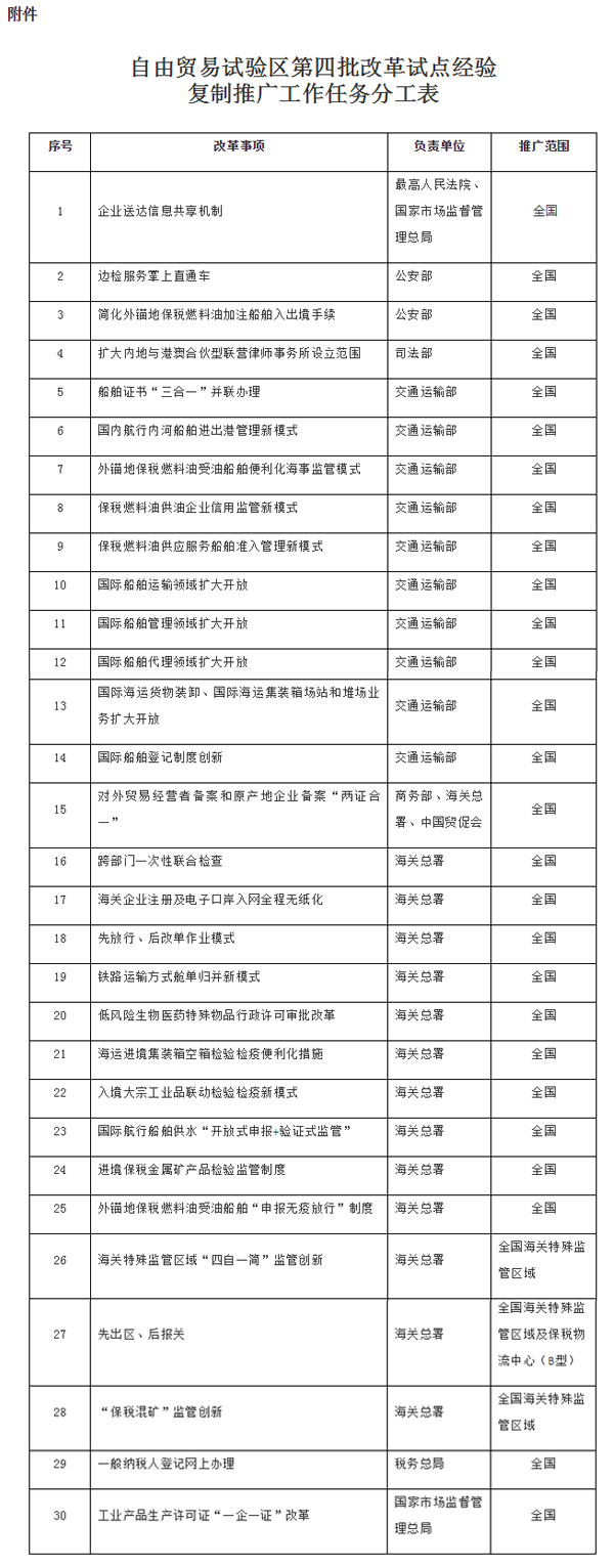 建设自由贸易试验区(以下简称自贸试验区)是党中央、国务院在新形势下全面深化改革和扩大开放的战略举措。按照党中央、国务院部署,11个自贸试验区所在省市和有关部门结合各自贸试验区功能定位和特色特点,全力推进制度创新实践,形成了自贸试验区第四批改革试点经验,将在全国范围内复制推广。现将有关事项通知如下: 一、复制推广的主要内容 (一)在全国范围内复制推广的改革事项。 各地区、各部门要以习近平新时代中国特色社会主义思想为指导,全面贯彻党的十九大精神,深刻认识复制推广自贸试验区改革试点经验的重大意义,将复制推广工作作为贯彻新发展理念、推动高质量发展、建设现代化经济体系的重要举措,更大力度转变政府职能,全面提升治理能力现代化水平,着力推动制度创新,进一步优化营商环境,激发市场活力,逐步构建与我国开放型经济发展要求相适应的新体制、新模式,推动形成全面开放新格局,不断增强经济创新力和竞争力。 各省(自治区、直辖市)人民政府要将自贸试验区改革试点经验复制推广工作列为本地区重点工作,加强组织领导,加大实施力度,强化督促检查,确保复制推广工作顺利推进,改革试点经验落地生根、取得实效。国务院各有关部门要主动作为,做好细化分解,完成复制推广工作。需报国务院批准的事项要按程序报批,需调整有关行政法规、国务院文件和部门规章规定的,要按法定程序办理。国务院自由贸易试验区工作部际联席会议办公室要适时督查复制推广工作进展和成效,协调解决复制推广工作中的重点和难点问题。复制推广工作中遇到的重大问题,要及时报告国务院。