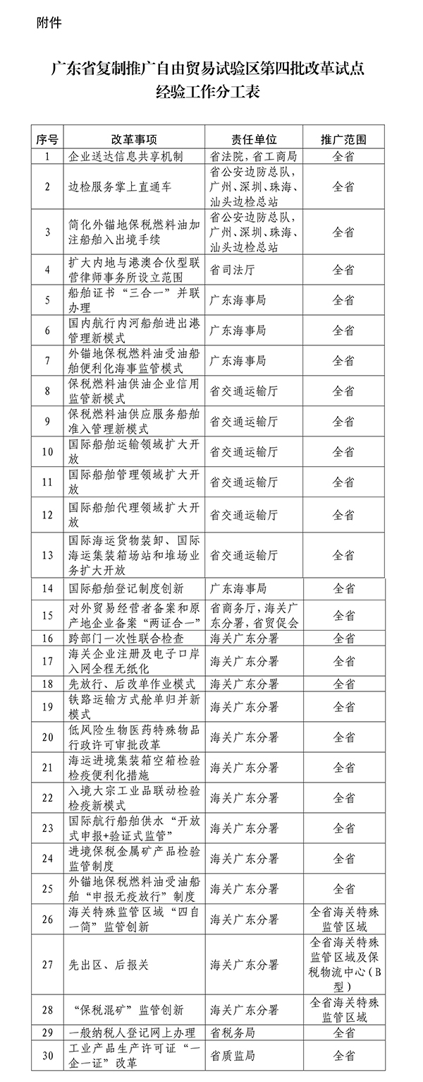 附件:广东省复制推广自由贸易试验区第四批改革试点经验工作分工表