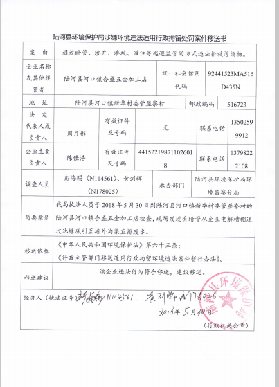 陆河县环境保护局涉嫌环境违法适用行政拘留处罚案件移送书(201801)